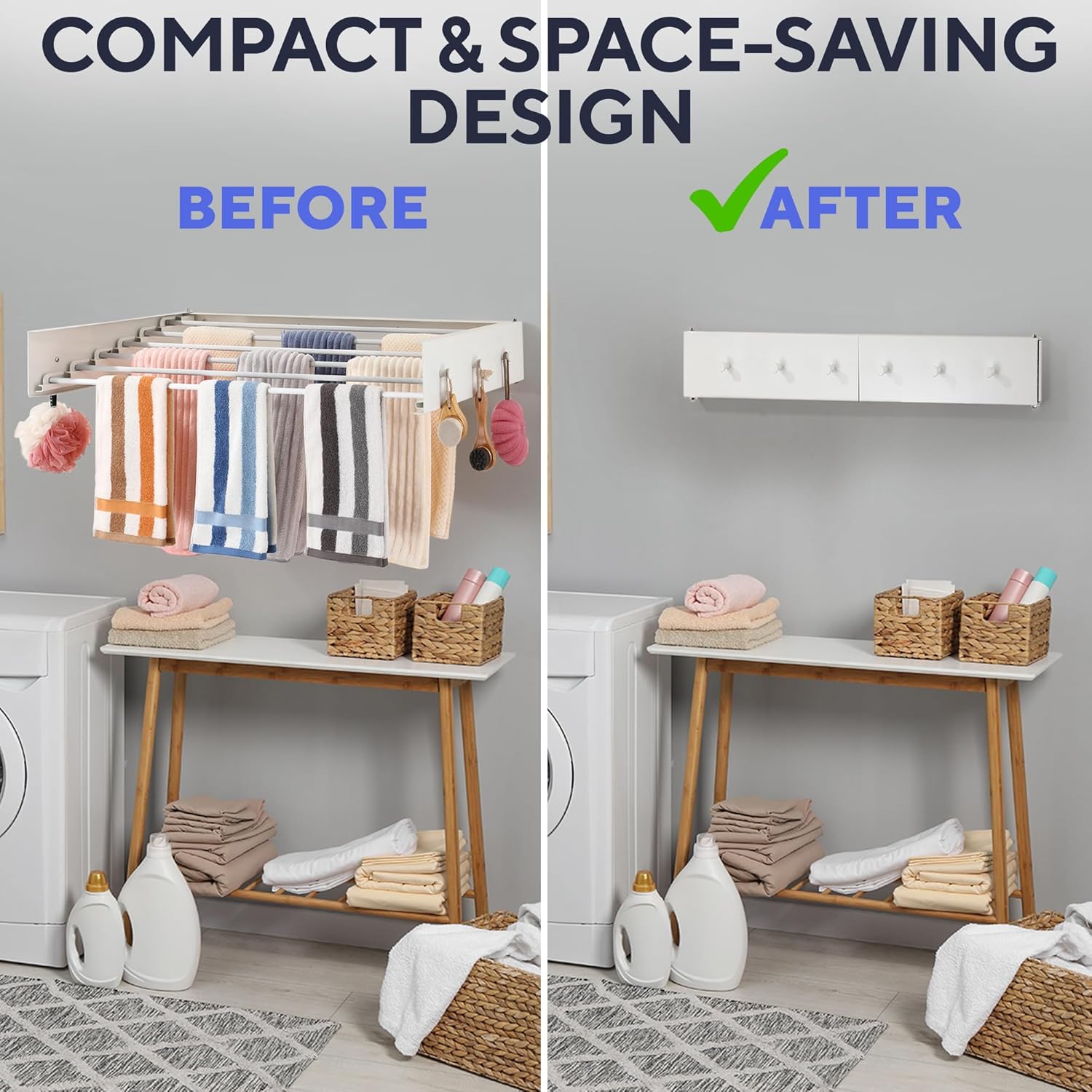 • Rock-Solid Stability for Any Load – Engineered for durability, our clothes drying rack wall mounted features 5 heavy-duty aluminum rods and a sturdy carbon steel base, supporting up to 66 lbs. Whether it’s towels, sweaters or clothing, this rack is designed to handle it all with confidence and reliability.