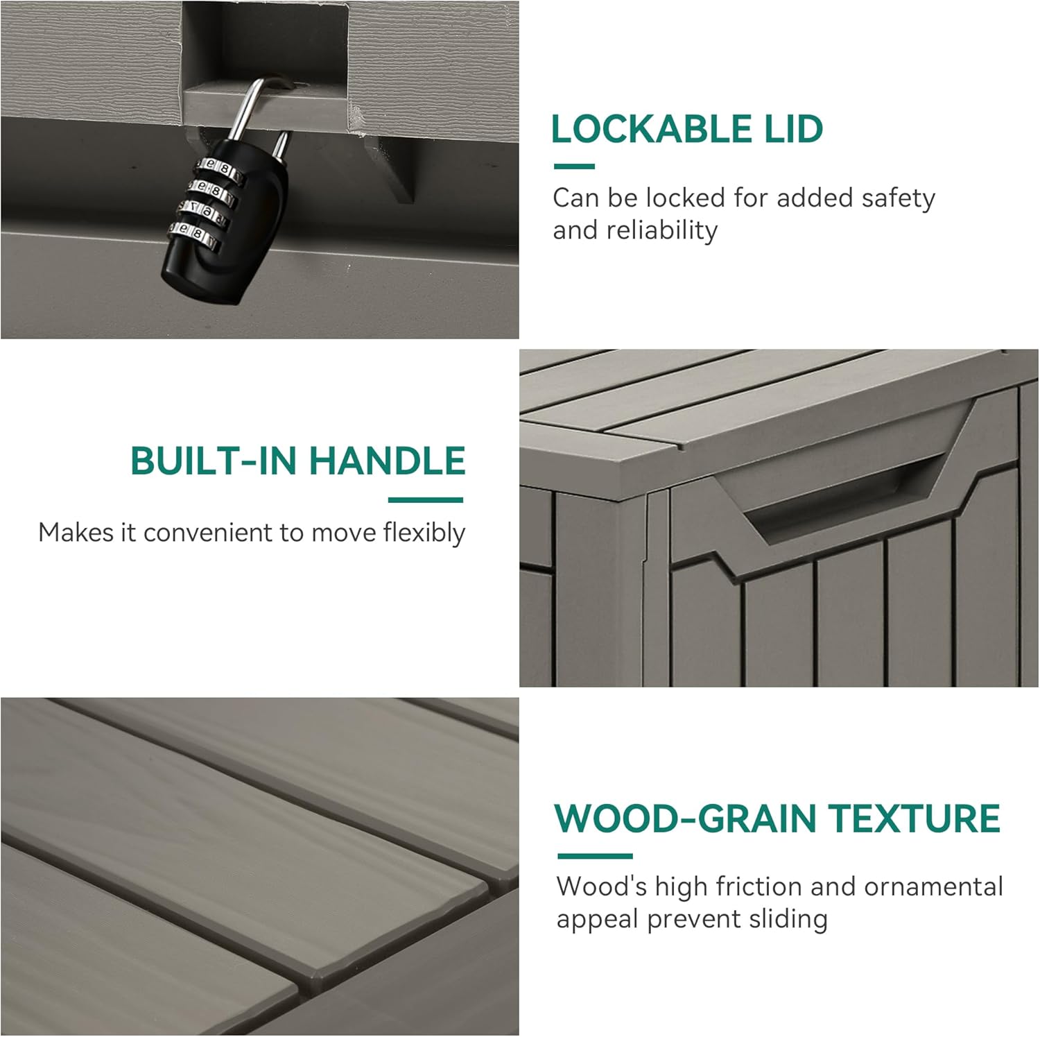 • Solid Build: Made from robust, weather-resistant resin, this outdoor storage box is designed to withstand water, rust, UV, fading, and various elements for long-lasting use