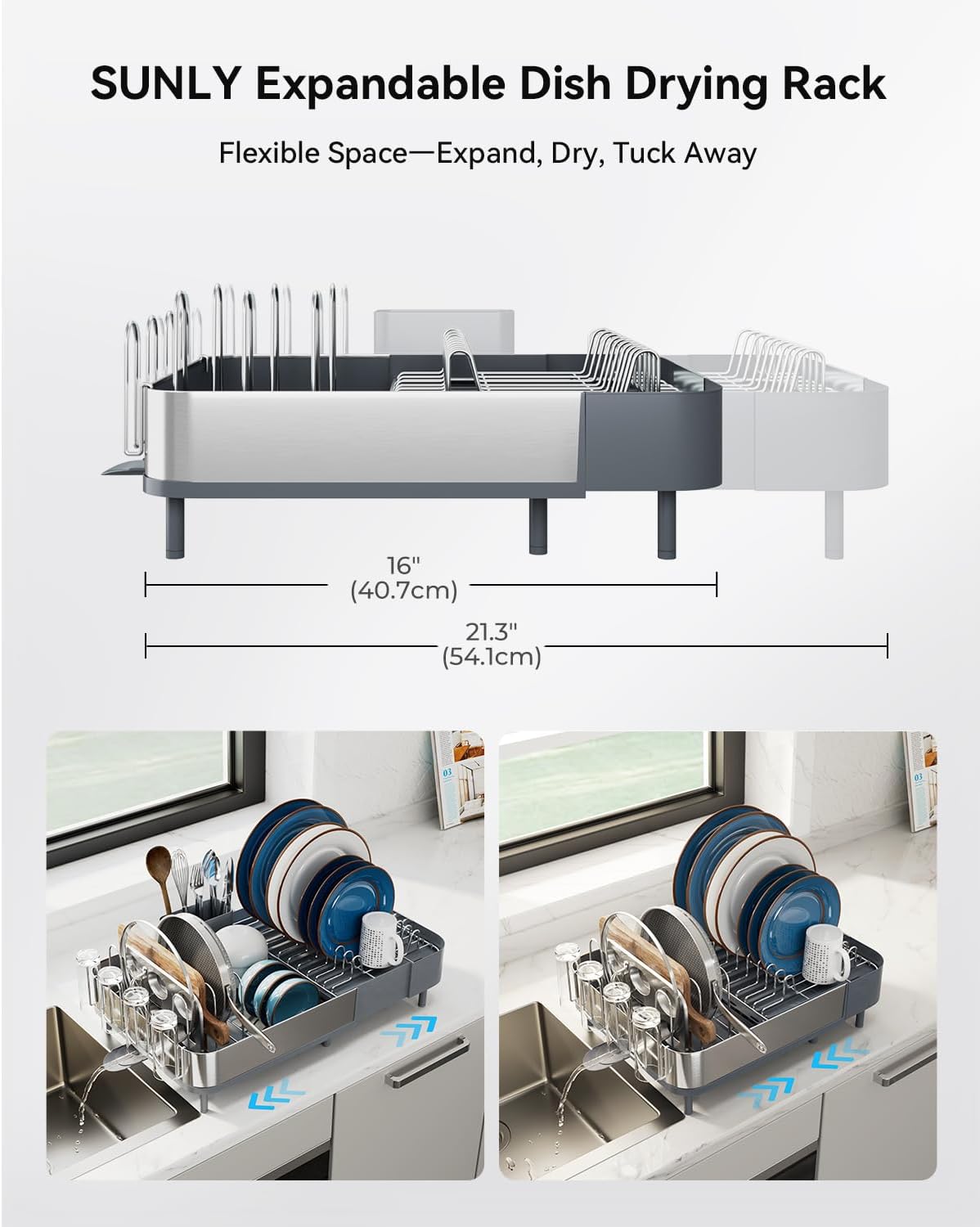 • [Expandable Design for Flexible Use]: Sunly expandable dish drying rack easily adjusts from 16” to 21.3” in length, giving you the flexibility to maximize drying space when needed, or keep it compact to save countertop space