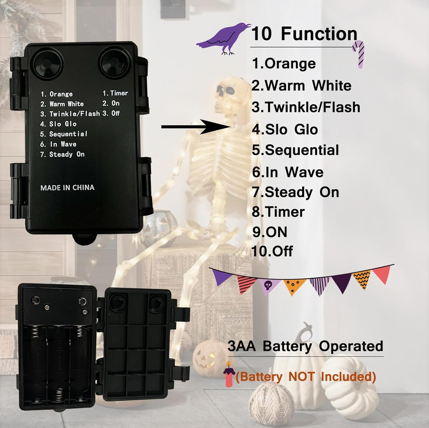 • LIGHTING FUNCTIONS: Featured with 7 lighting functions including orange, warm white, twinkle, slo glo, sequential, in wave and bi color steady on, Requires 3AA battery operated. Light up for 6 hours and then turn off automatically, power back on 18 hours later. Batteries NOT included