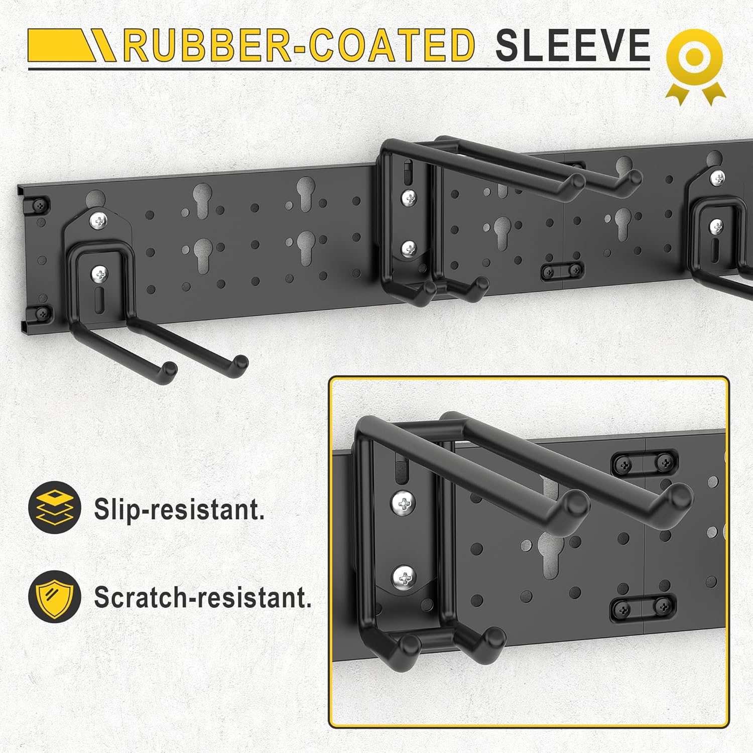 • Ultra-Durable Construction—The garage storage rack is crafted from powder-coated steel -resists of rusting, chipping and cracking for years of wear and tear. The rubber coated sleeve prevents the tool from scratching or sliding. Holds up to 330lbs.