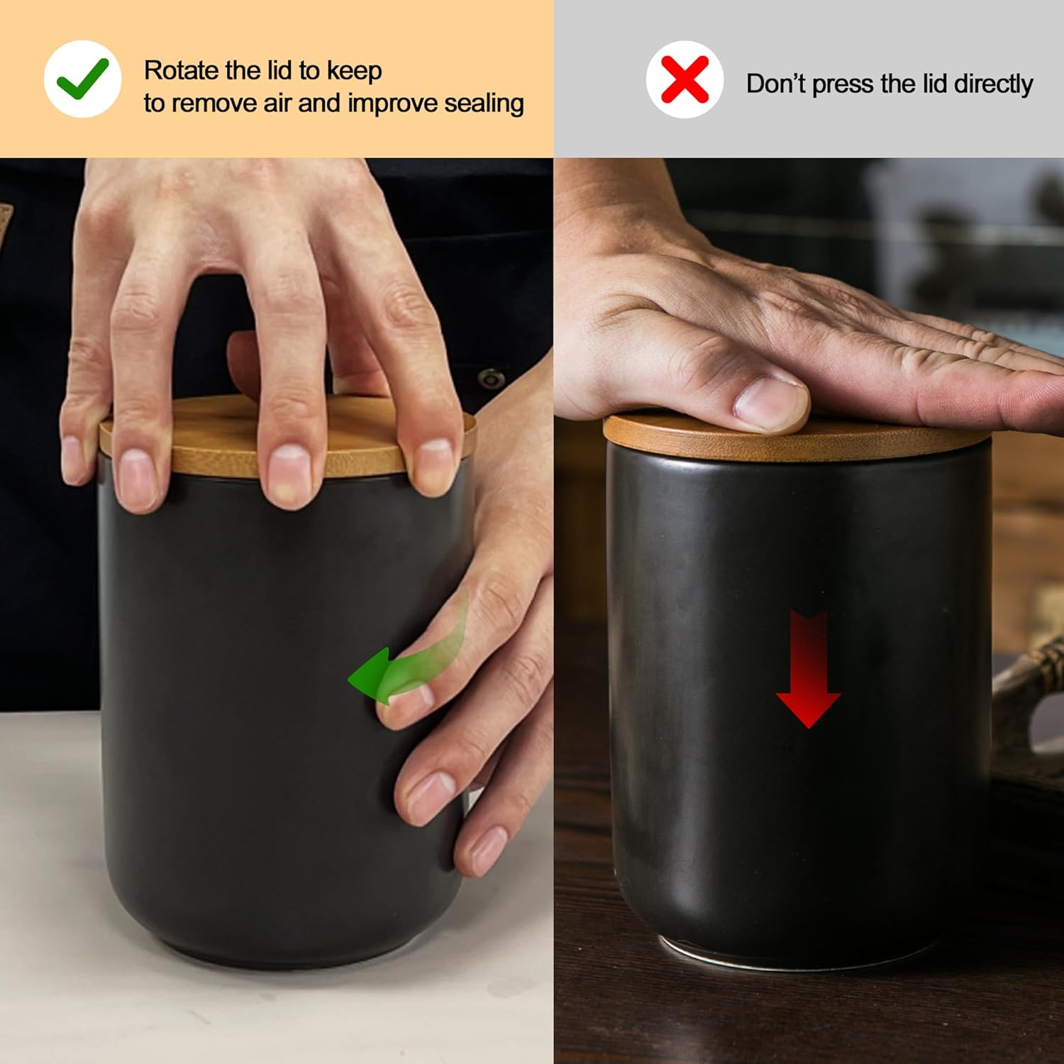 • Airtight Seal with Durable Wooden Lid - Each canister comes with a high-quality wooden lid and a silicone sealing ring, providing an airtight closure that keeps your ingredients fresh and dry. And the leather strap on top adds a functional touch for easy handling. To ensure the best seal, screw the lid tightly like turning a screw, effectively removing air and keeping your contents fresh. Please don't pressing down on the lid, it may not create a proper seal and could cause the rubber seal to pop out.