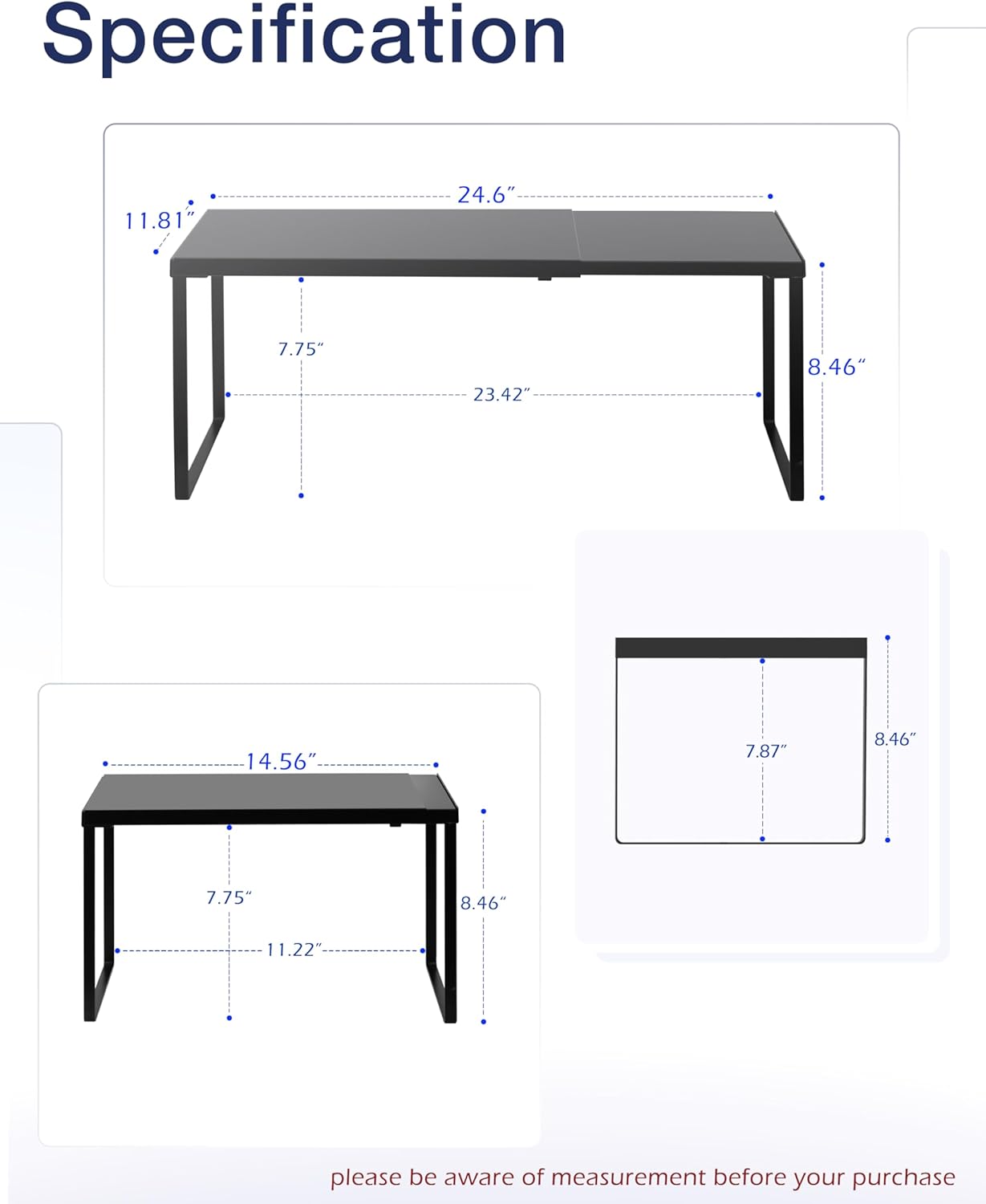 • SPECIFICATION: 11.8’’D * 14.56-24.6’’W * 8.46’’H. If you purchase 2 of these expandable shelves set you can stack one of top of another thereby creating a two-tier storage space. Easy to assemble with a clear manual.