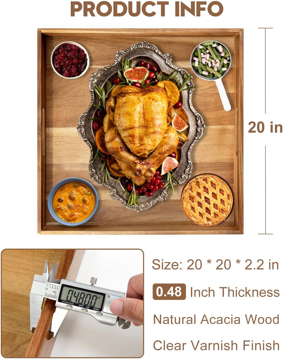 20 Inches Square Acacia Wood Ottoman Tray, Extra Large Wooden Serving Tray with Handles for Living Room, Serving Food Breakfast, Ottoman Coffee Table Couch Sofa Kitchen