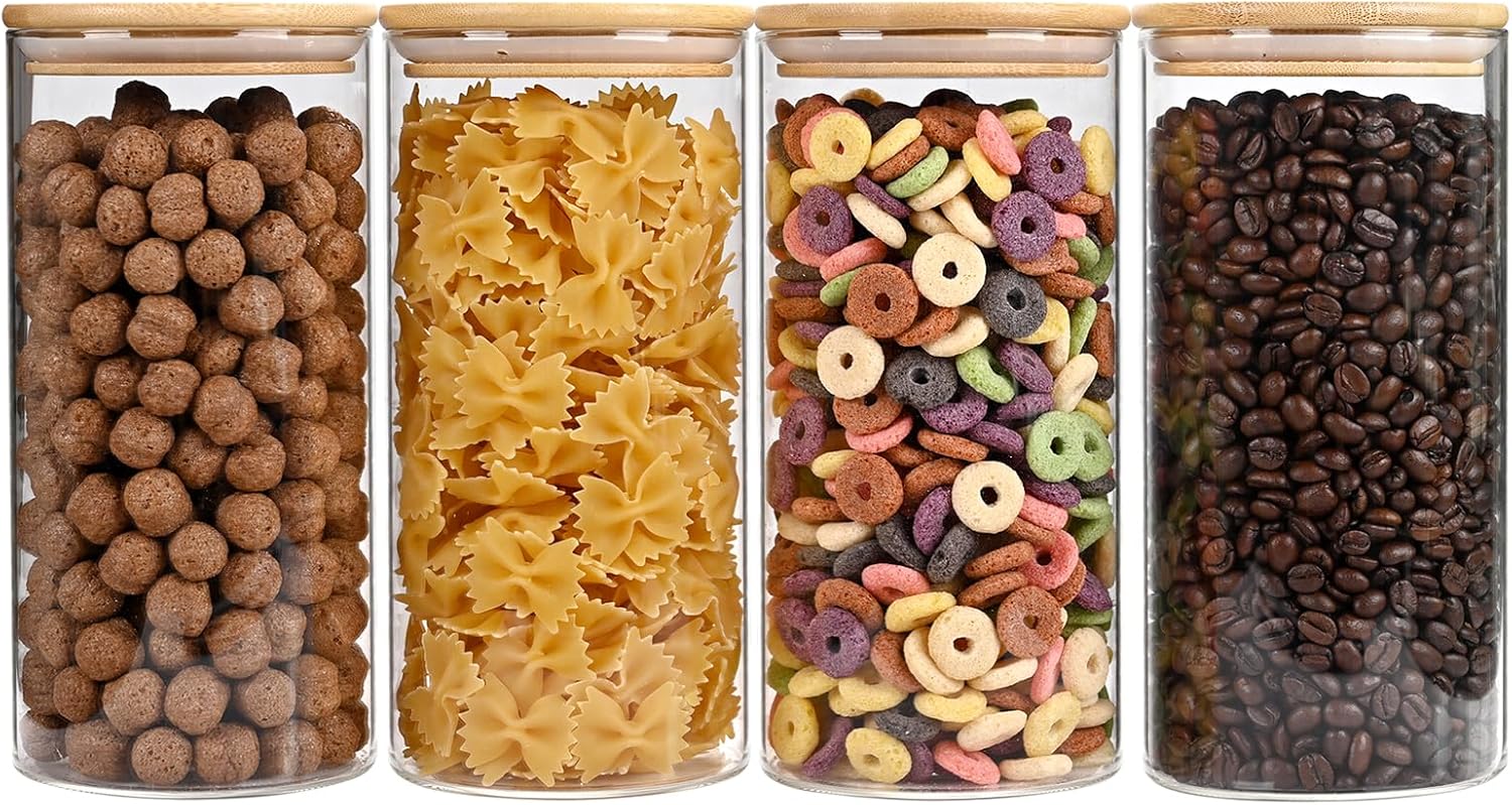 53oz Glass Food Storage Jars, Glass Jars with Bamboo Lids, Kitchen Storage Jars, Set of 4, Canisters with Airtight Lids for Spice, Coffee, Cookie, Pantry Organizers