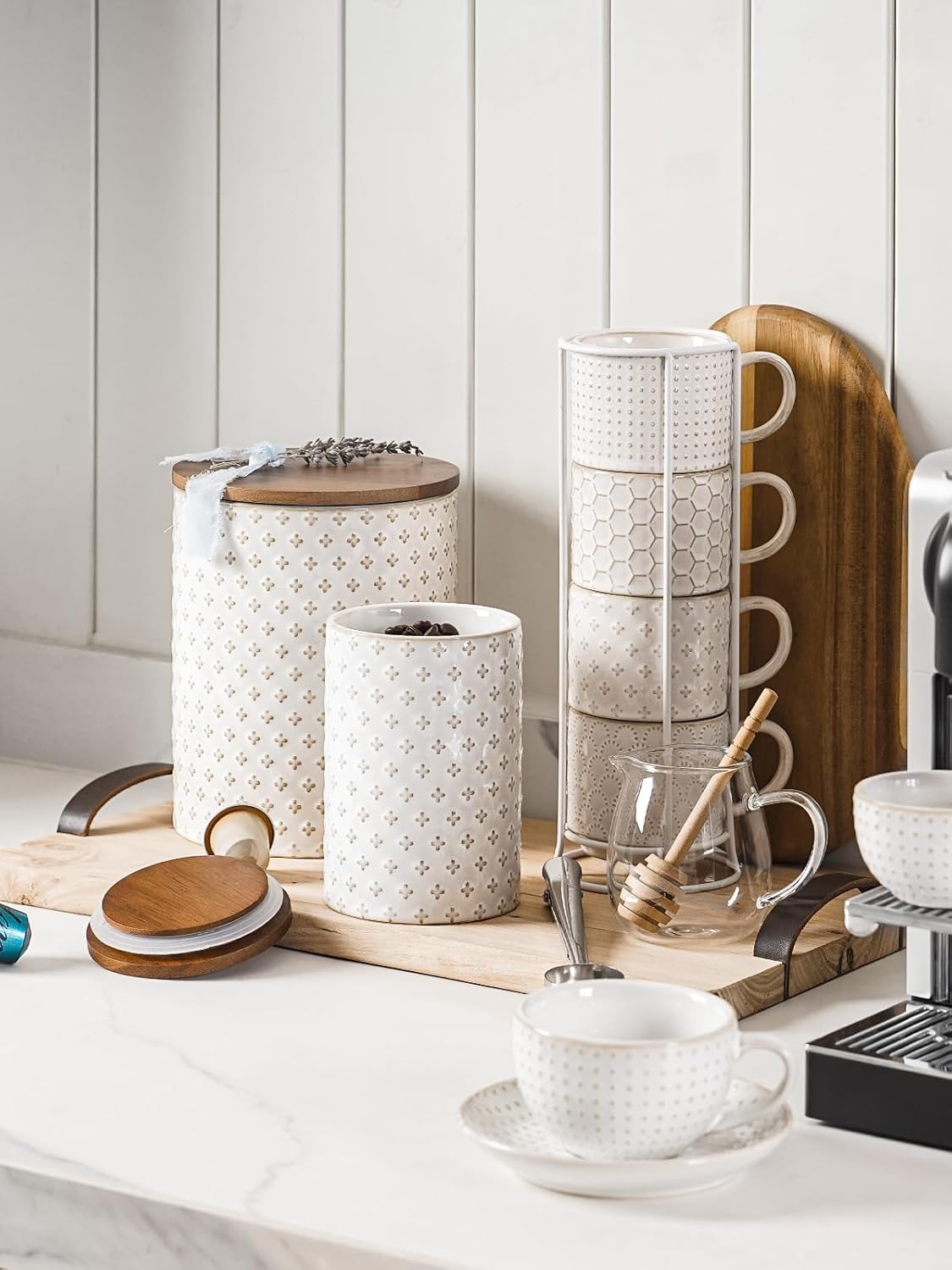 • Embossed Design: Featuring an arctic white glaze with a charming embossed pattern, these farmhouse-style ceramic jars will add warmth and vitality to your home. Their elegant design complements various home styles, making them the perfect addition to your countertop or coffee corner. Enhance your home’s aesthetics and let these jars become a standout decorative element in your living space