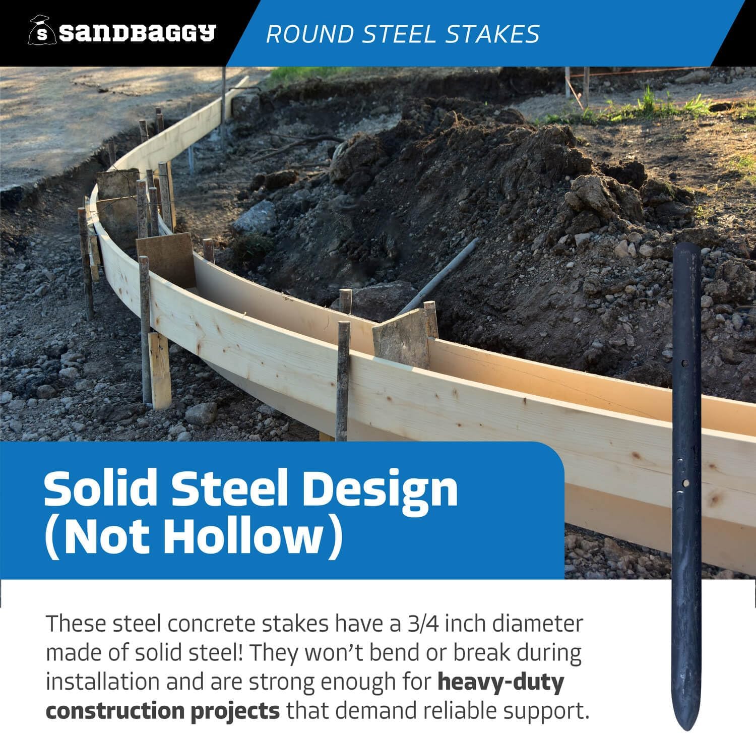 • SOLID STEEL DESIGN (NOT HOLLOW): These steel concrete stakes have a ¾ inch diameter made of solid steel! They won’t bend or break during installation and are strong enough for heavy-duty construction projects that demand reliable support.