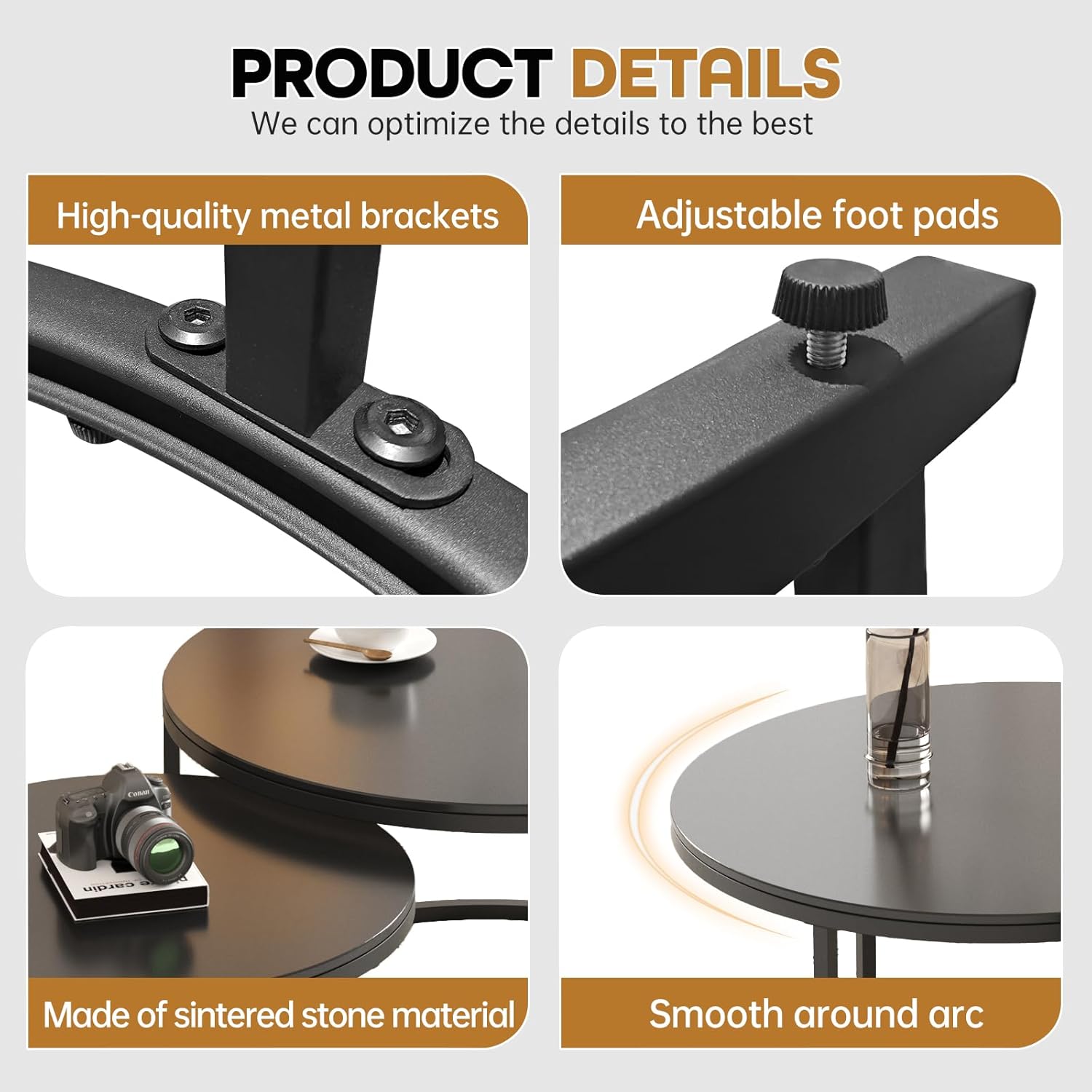 • [Sturdy and Durable] Nesting coffee table set of 2 for living room, includes a larger table and a smaller round coffee table, small nesting table: 16"(D) x 16"(H), large nesting table. 24"(D) x 18"(H). Our durable and stable nesting coffee table consists of a sintered stone table top and sturdy metal legs.