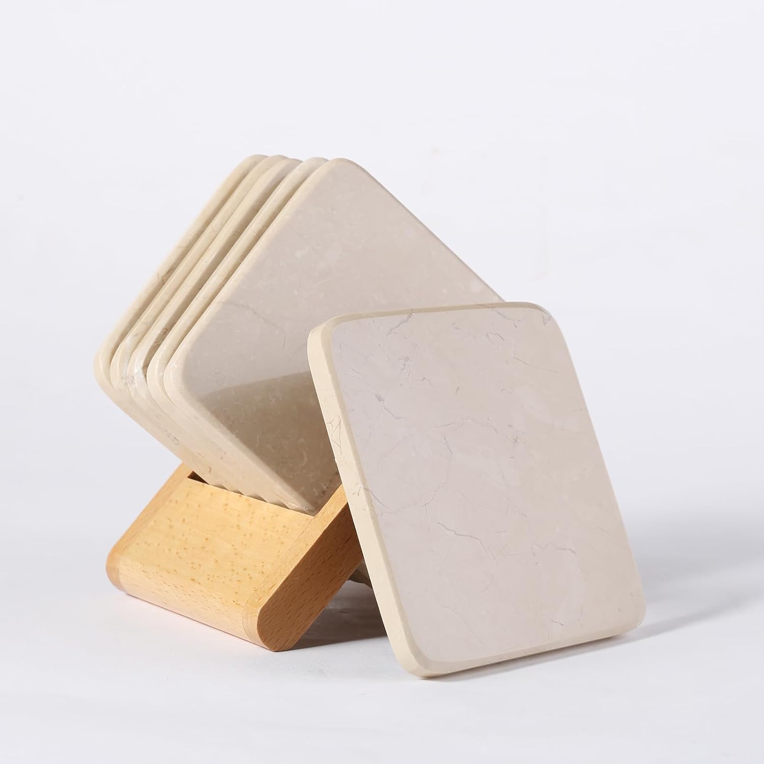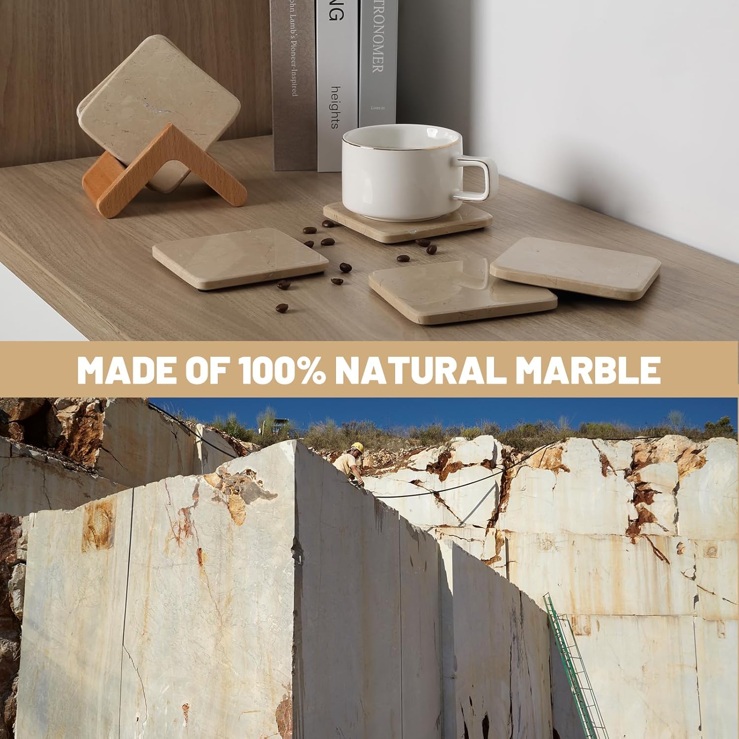BCS Marble Coasters Set of 6 with Holder, Square Stone Drink Coasters for Coffee, Wine and Cocktails, Non-Slip Durable Cup Mats, Elegant Home, Bar & Kitchen Table Decor (Crema Beige)