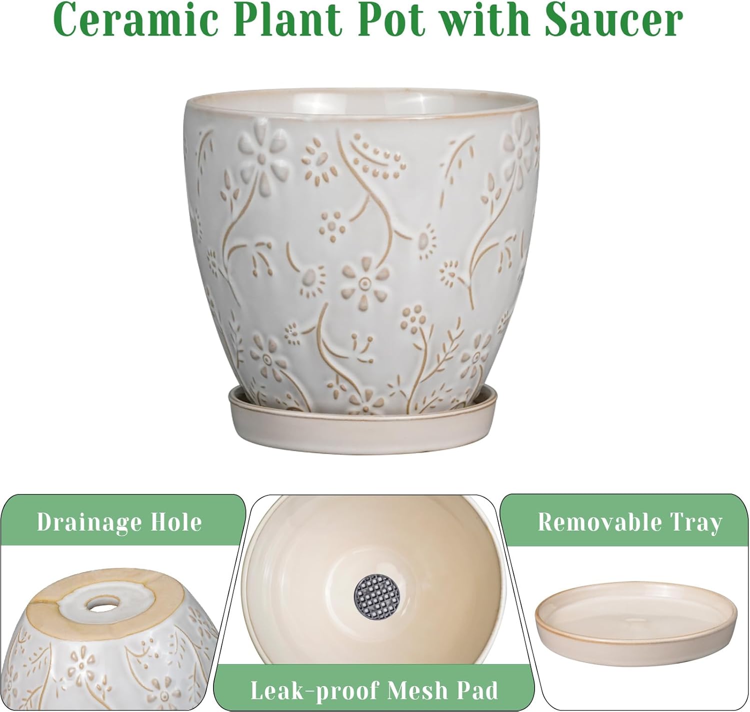 • Stylish Appearance: Our ceramic plant pot has a white main colour, a beautiful embossed petal and leaf pattern on the surface, elegant appearance making it ideal for home decor, garden decor and office decor