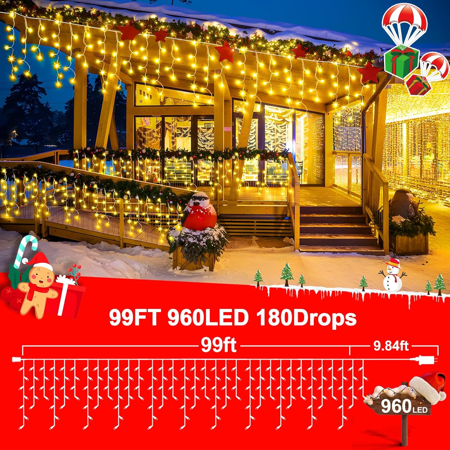 KNONEW 99ft 960 LED Christmas Lights Outdoor Decorations with 180 Drops, 8 Modes Curtain Fairy Light, Clear Wire LED String Light Indoor Decor for Wedding Party Christmas(Warm White)