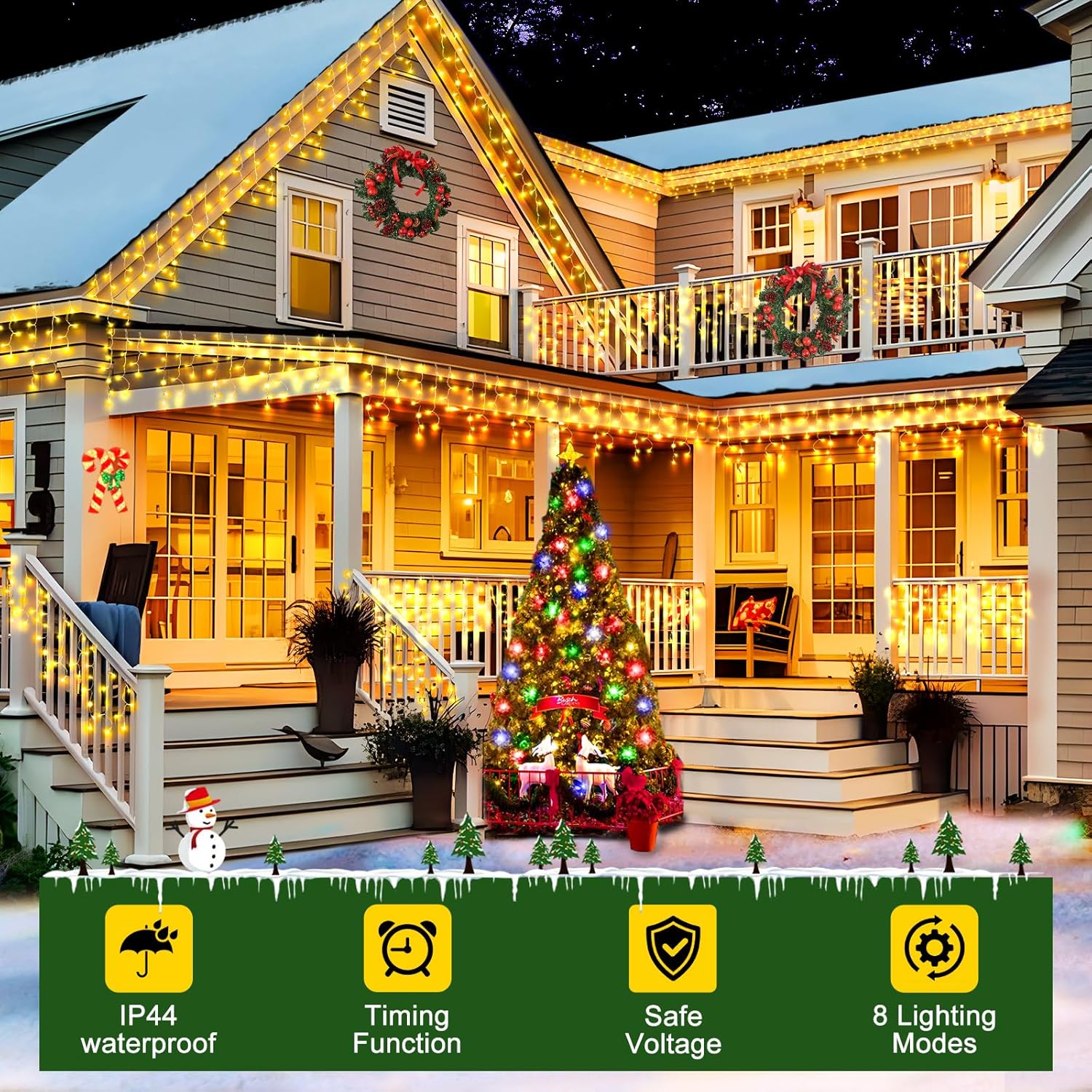 • 1 Steady On +7 Lighting Modes: Stay away from single lighting mode! Switched the 8 lighting modes by pressing the button on the Plug (Combination/In Waves/Sequential/Slo-Glo/Chasing/Slow Fade/Flash/Steady On). When you are hosting a lively Christmas gathering, variable Lighting Modes allows you to set the perfect mood for any occasion. Take your Christmas party to the next level with these professional Christmas string lights, and get more compliments from your neighbors.