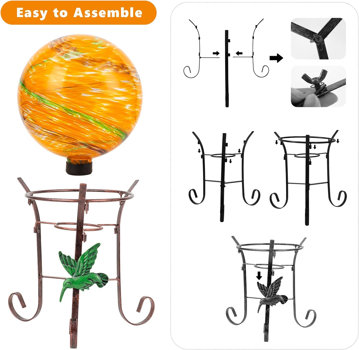 • Exquisite Design: The glass gaze globe designed with swirls of color for an unique artisanal look and copper gazing globe stand with a green hummingbird decor, this exquisite gazing ball with holder set will catch the eyes of garden lovers and interior decorators alike, adding a different kind of surprise while providing your home with a gorgeous decoration
