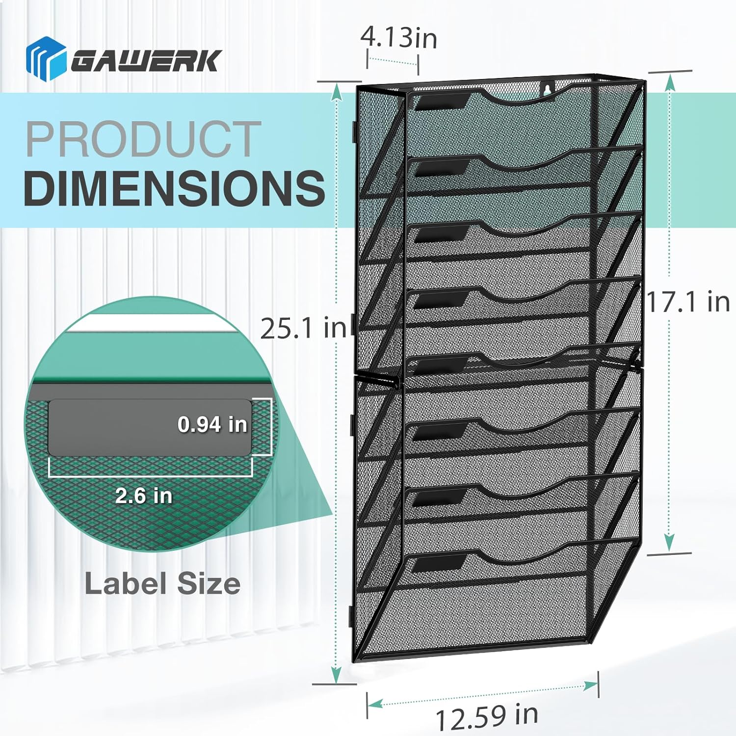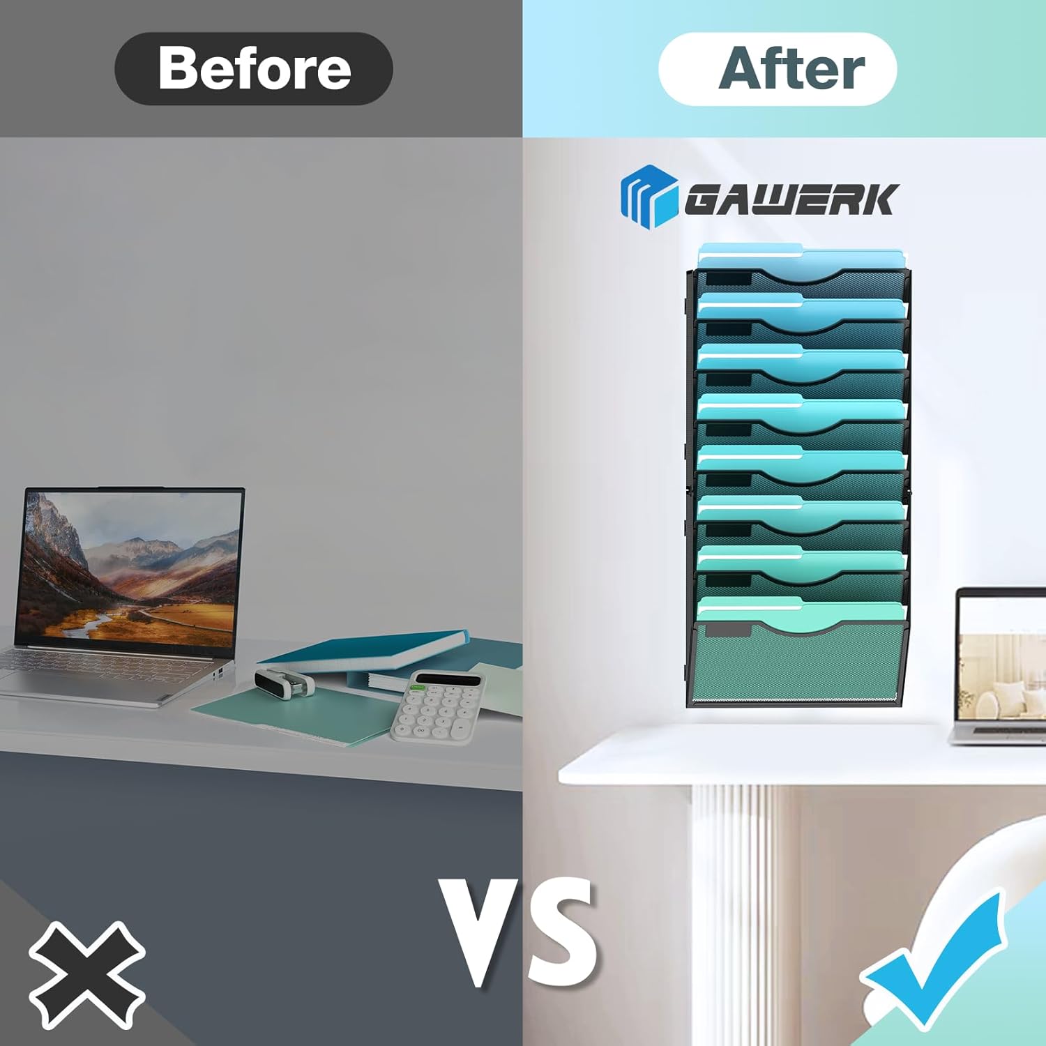 • Sturdy Metal Structure - Gawerk hanging paper organizer is made of high-quality metal materials. This magazine rack wall mounted has a powder coating, oxidation resistance and rust prevention, effectively prolonging its service life.