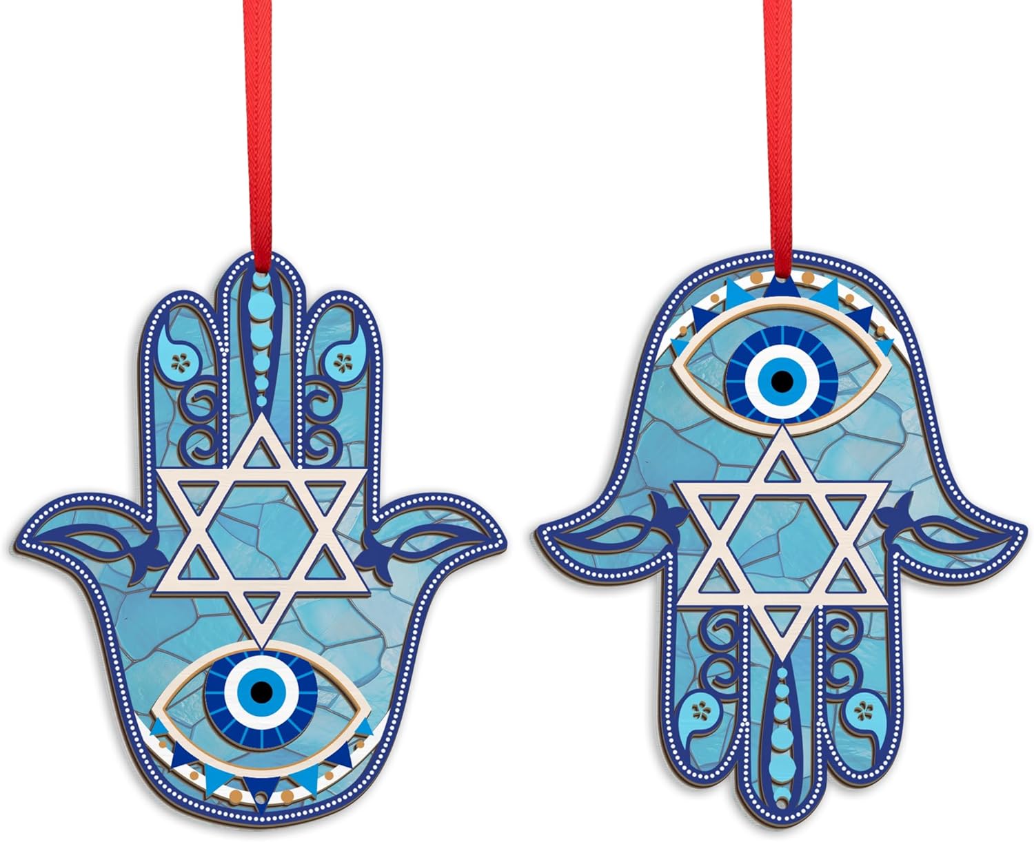 • APTIVATING LIGHT & COLOR - Illuminate your space with our suncatcher Christmas ornaments. Our single ornament features two unique hanging designs, not a pack of two, but you can choose between two beautiful sides to cast a radiant light display: one featuring a Star of David for blessing and the other showcasing protection against Evil Eyes.