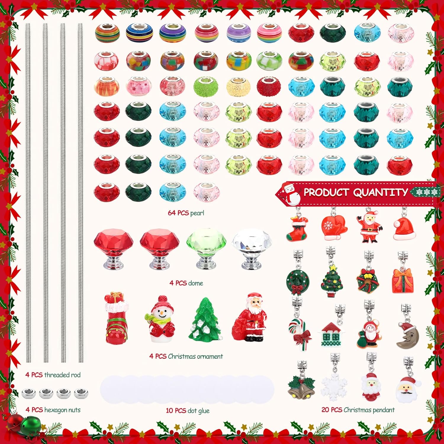• PACKAGE INCLUDED: Our beaded garden stakes are decorated with exquisite glass bead tops, which are beautiful and uniquely artistic. You will receive a total of 110pcs products, including 4 crystal stoppers, 4 12-inch threaded rods, 20 Christmas-style pendants, 4 Christmas decorations ornaments, 4 screw caps, 10 glue dots, 64 colorful beads