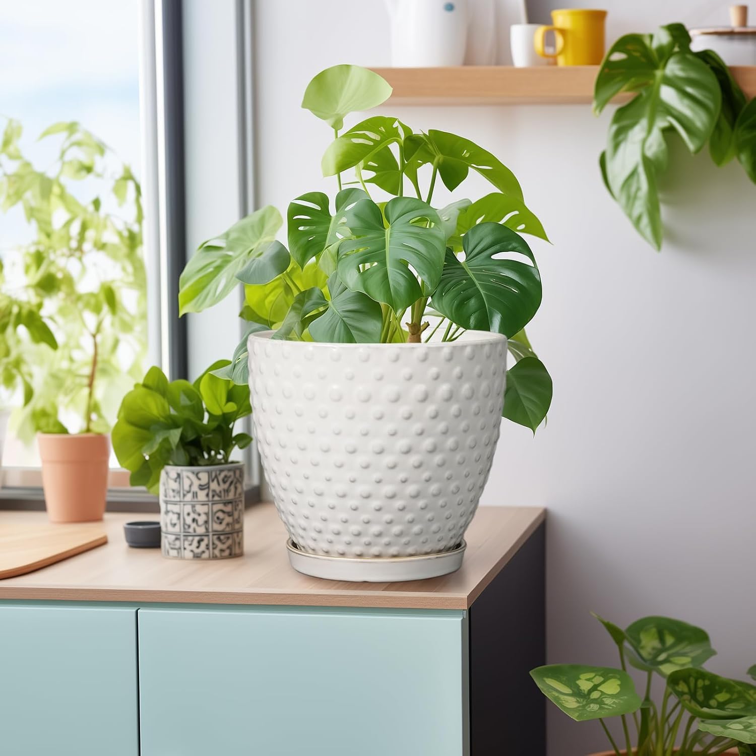 • Ideal Size: Each ceramic flower pot is 8.5 D x 7.5 H, which can provide enough space for your plants to thrive. One package includes white planter, ceramic tray and mesh