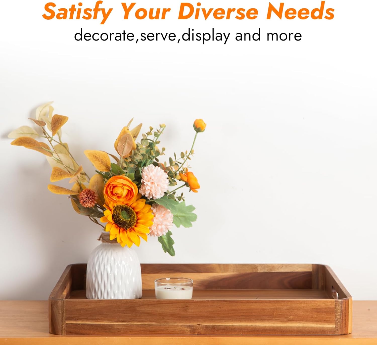 • 【Superior Wood Serving Tray】Made of natural acacia wood of high quality,lightweight but durable enough for serving food.The built-in handles makes the transporting foods and drinks safely and securely.