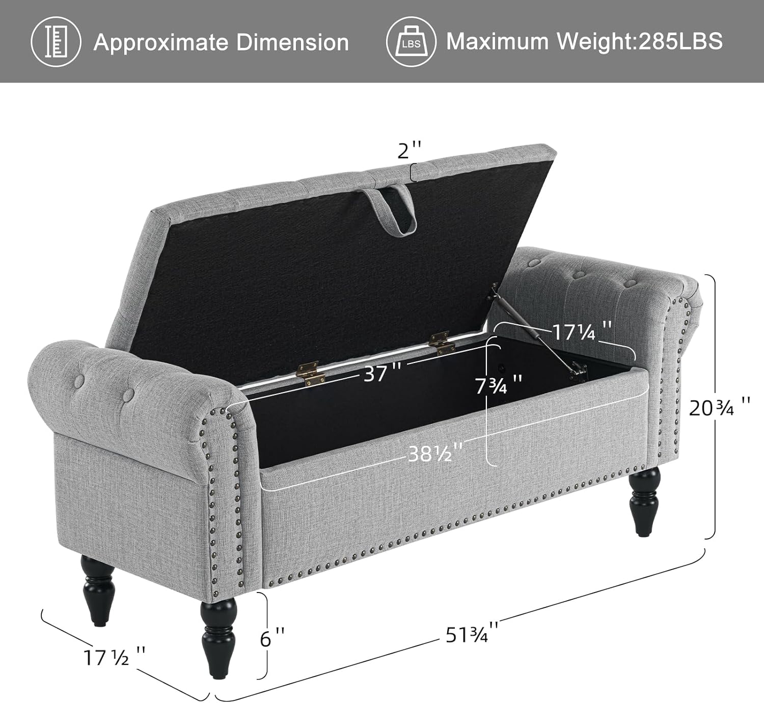 • ·Modern Design: Our storage ottoman showcases deep button tufting and elegantly rolled arms, capturing the essence of a truly modern piece. With a sophisticated structure, this bedroom storage bench embodies a minimalist style that prioritizes comfort and practicality.Diamond Stitch Button Tufting: The button-tufted stitching on the lid enhances the modern designthis of this end of bed bench. The diamond stitch pattern introduces subtle texture while maintaining optimal comfort.