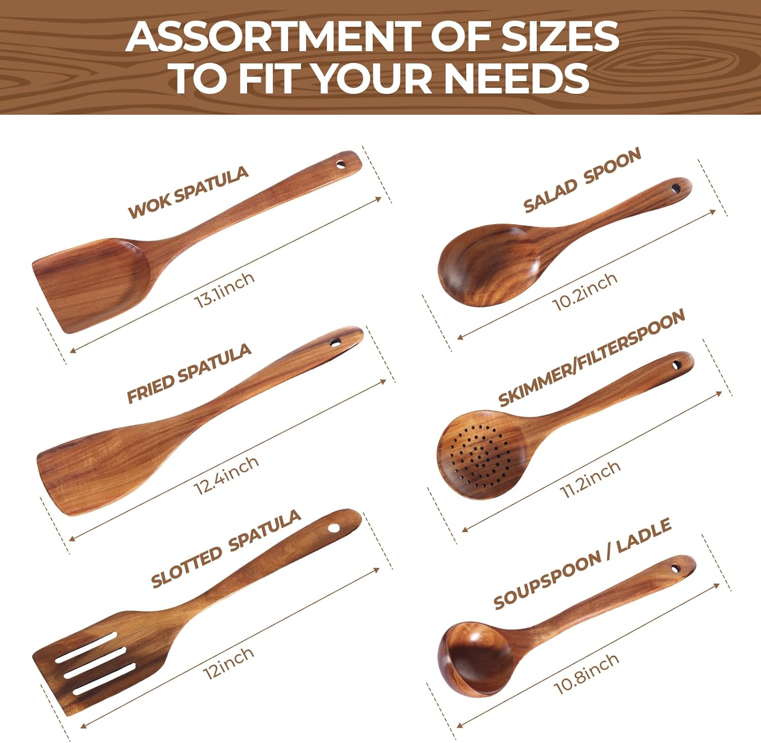 • 100% Natural Teak Wood--Crafted from 100% teak, meticulously cut and polished from a single piece of teak, this wooden kitchen utensils are both Durable and Lustrous. This Non-toxic wooden utensil set are suitable for everyday use without the concern of easily being damaged