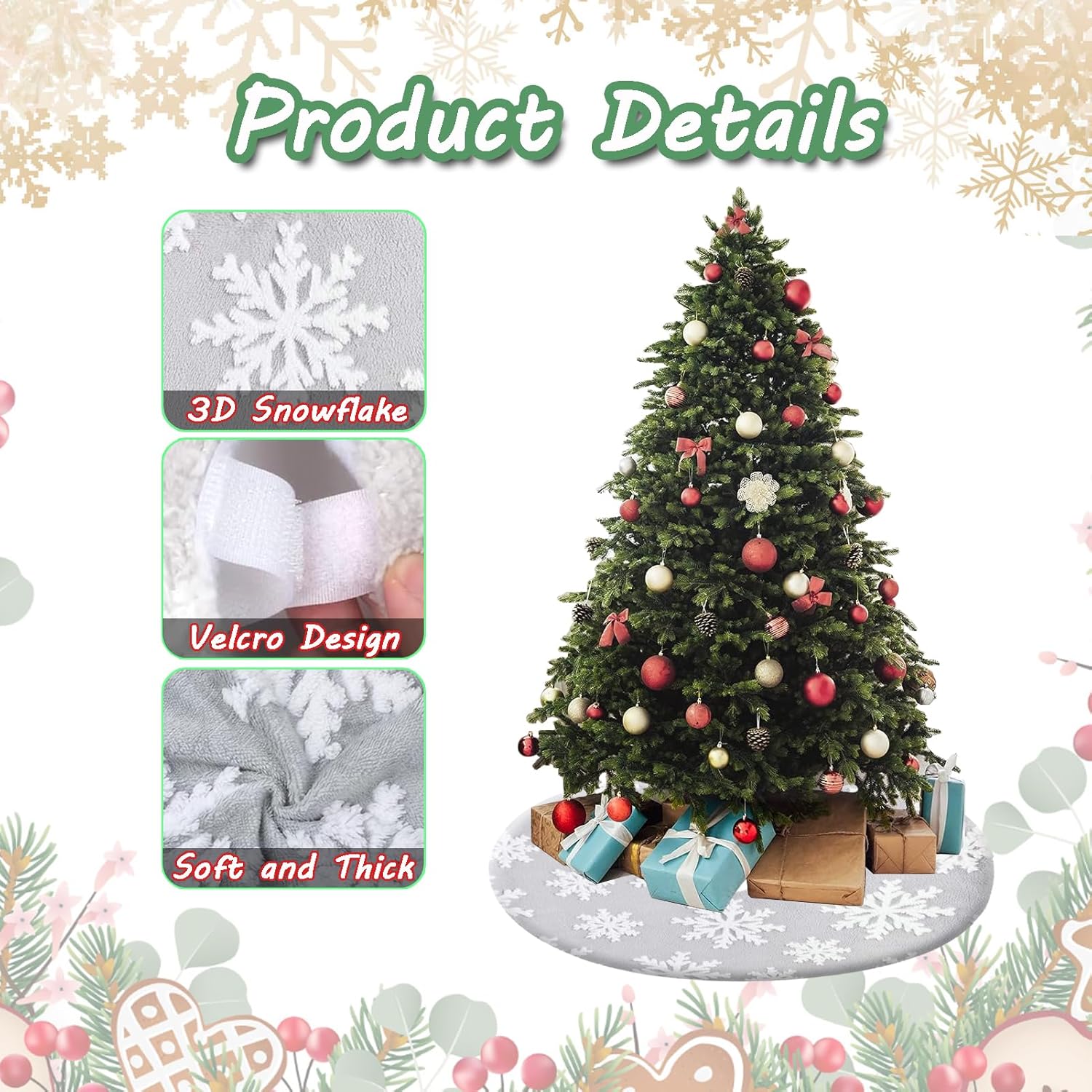 • 🎄 🎄 【Luxurious 3D large snowflakes】 - The beautiful tree skirt is designed with a handmade 3D large snowflake create a wonderful, magical effect. Grey plush and White snowflakes create a perfect Christmas scene.