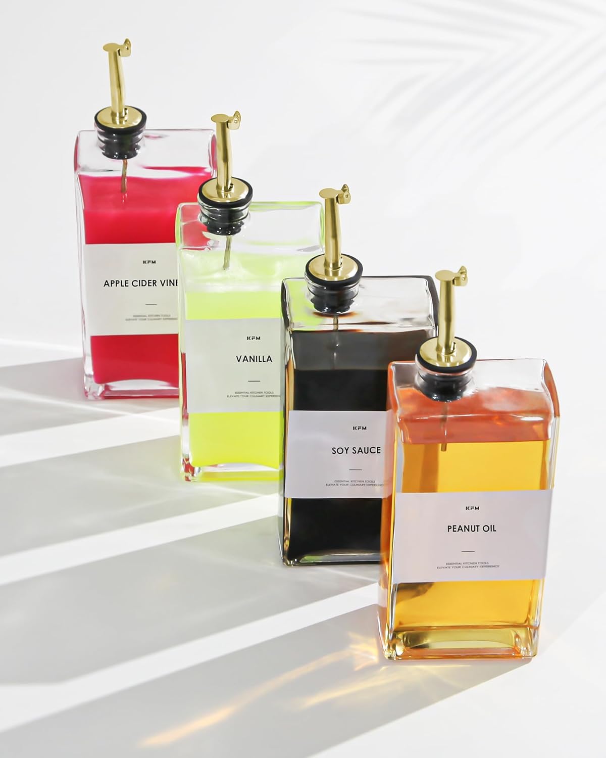 • [12OZ/350ML Large Capacity Oil Dispenser Set]: With elegant rectangular olive oil dispenser bottle set enhance your kitchen decor also very pragmatic. This set includes two high-quality 12 oz (350 ml) glass bottles, four gold pourers, a funnel, and 35 designed labels and 5 blank labels for your custom use.