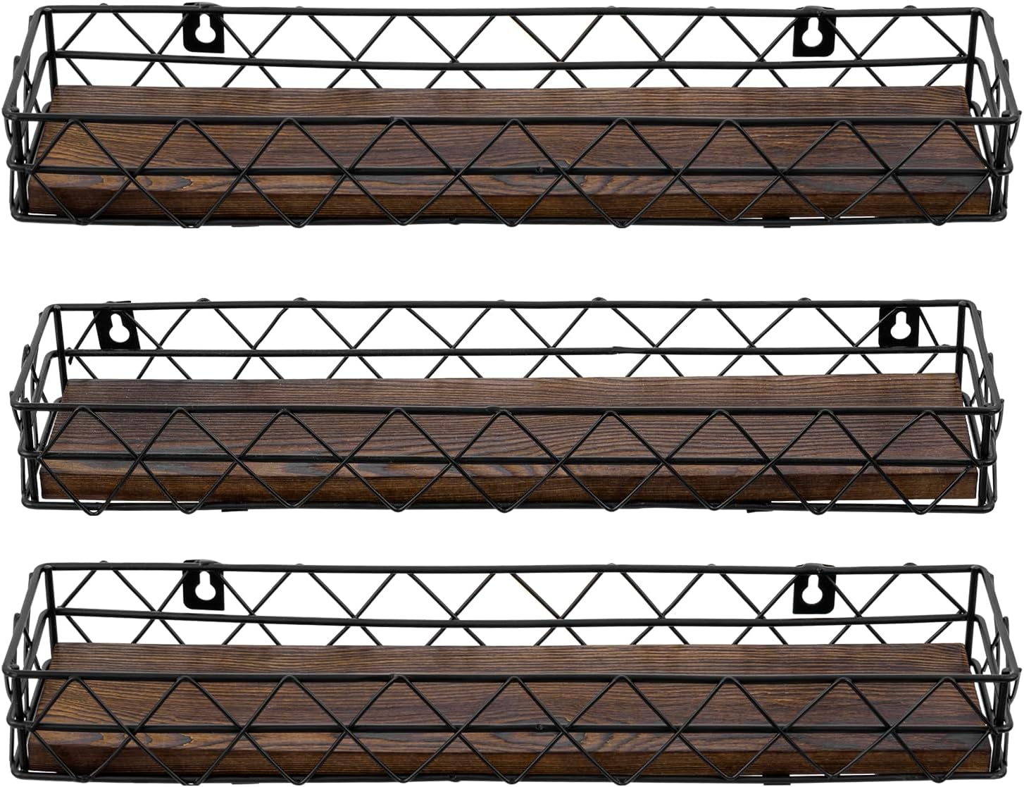 MyGift 14 Inch Wall Mounted Kitchen Spice Racks, Rustic Burnt Solid Wood and Black Metal Wire Geometric Hanging Organizers for Seasoning Jars or Condiment Bottles, Set of 3