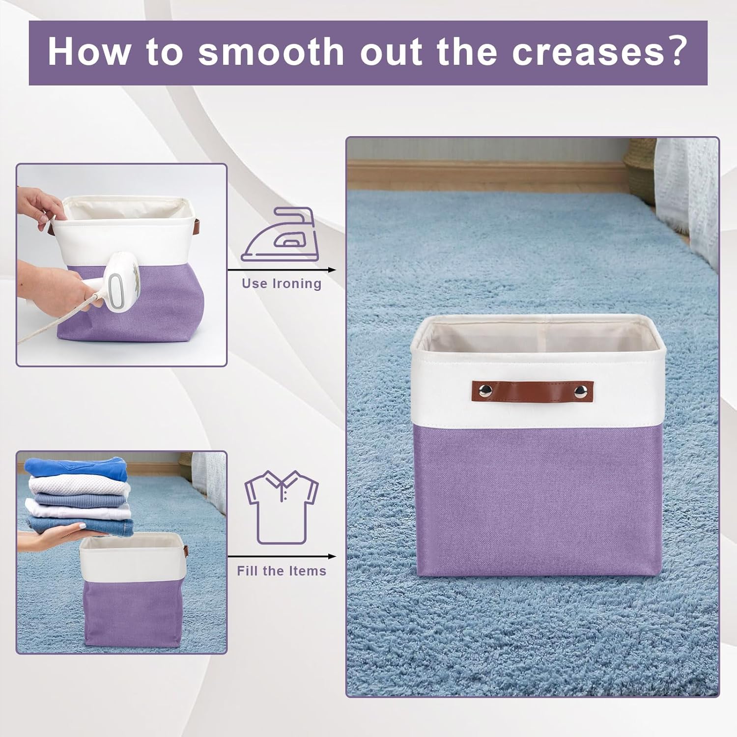 • 【Maintenance & Care Tip】 - Collapsible design for space saving. Our foldable baskets comes in a compression packing which may result in wrinkled storage bin during the long transit. Get rid of the wrinkles by either stuffing the fabric storage bins with blankets and pillows for a few days or steam iron them at low-heat setting. The organization baskets are easy to clean, you can dust the basket with a soft cloth with light soapy water when needed. Not recommended to machine wash.