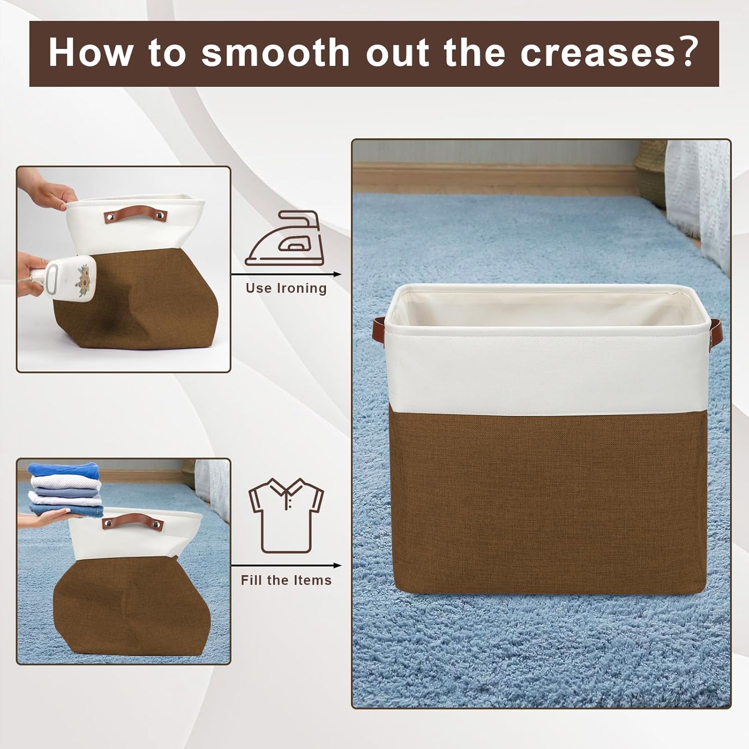 • 【Maintenance & Care Tip】 - Collapsible design for space saving. Our foldable baskets comes in a compression packing which may result in wrinkled storage bin during the long transit. Get rid of the wrinkles by either stuffing the fabric storage bins with blankets and pillows for a few days or steam iron them at low-heat setting. The organization baskets are easy to clean, you can dust the basket with a soft cloth with light soapy water when needed.