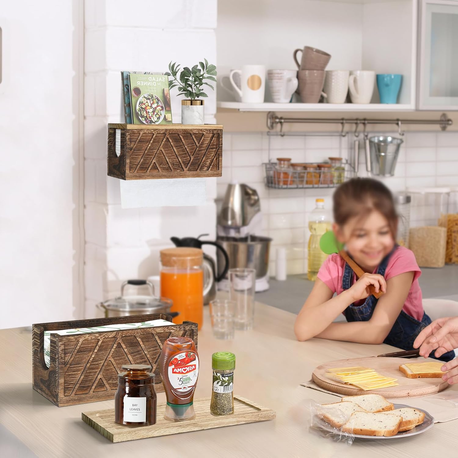 • ✨【Practical Paper Towel Holder for Farmhouse Decor】Our bathroom napkin dispenser is practical and beautiful. With wide and smooth opening bottom, our wall mount paper towel holder helps you easily access to the towel paper you need. In addition, the brown lid, exquisite carving, and dark brown appearance of the bathroom paper towel holder adds a rustic home decor to the room.Whether on display on your countertop, or hang on your home wall, the bathroom paper towel holder is an eye-catching focus.