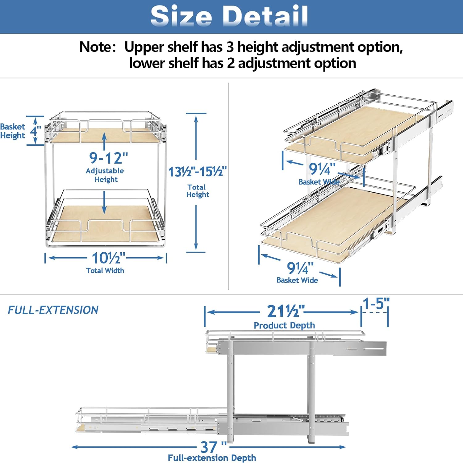 • 【Item Size】Dimensions: 10½"W x 21½"D x 15.5"H. Fits 11" cabinet openings and larger. Please measure your cabinet opening from hinge to opposite side. Its heavy duty construction design makes it totally capacity up to 100 lbs.