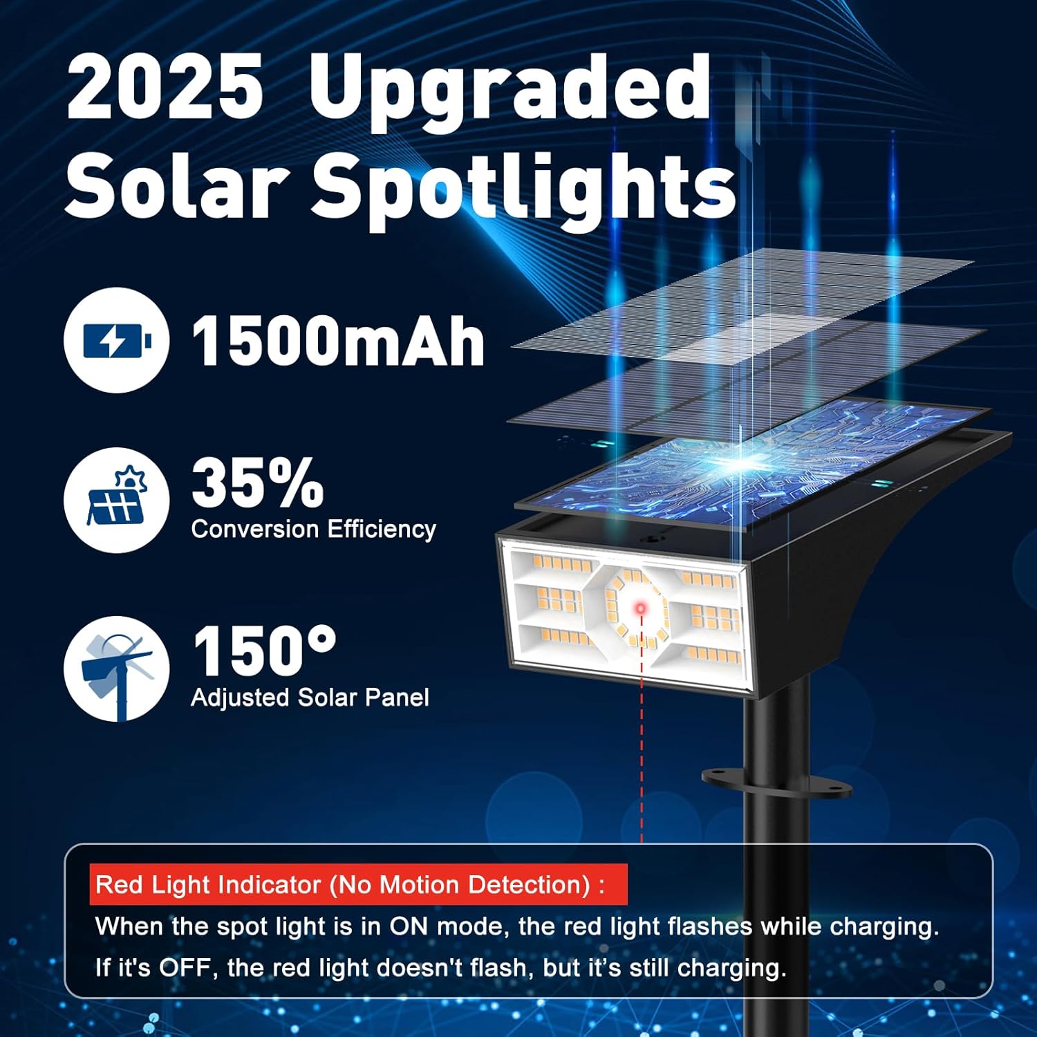 • 【𝐋𝐨𝐧𝐠-𝐋𝐚𝐬𝐭𝐢𝐧𝐠 𝐈𝐥𝐥𝐮𝐦𝐢𝐧𝐚𝐭𝐢𝐨𝐧】 Equipped with 56 LEDs, our solar spotlights create the perfect lighting effect wherever they are placed. The 150° adjustable head allows you to direct light exactly where you need it. Harness the power of the sun to brighten your garden without high electricity costs. With a maximum brightness of 1000 lumens, these solar landscape spotlights provide 10-24 hours of illumination depending on charge time—longer, brighter, and more durable than other solar spotlights on the market.