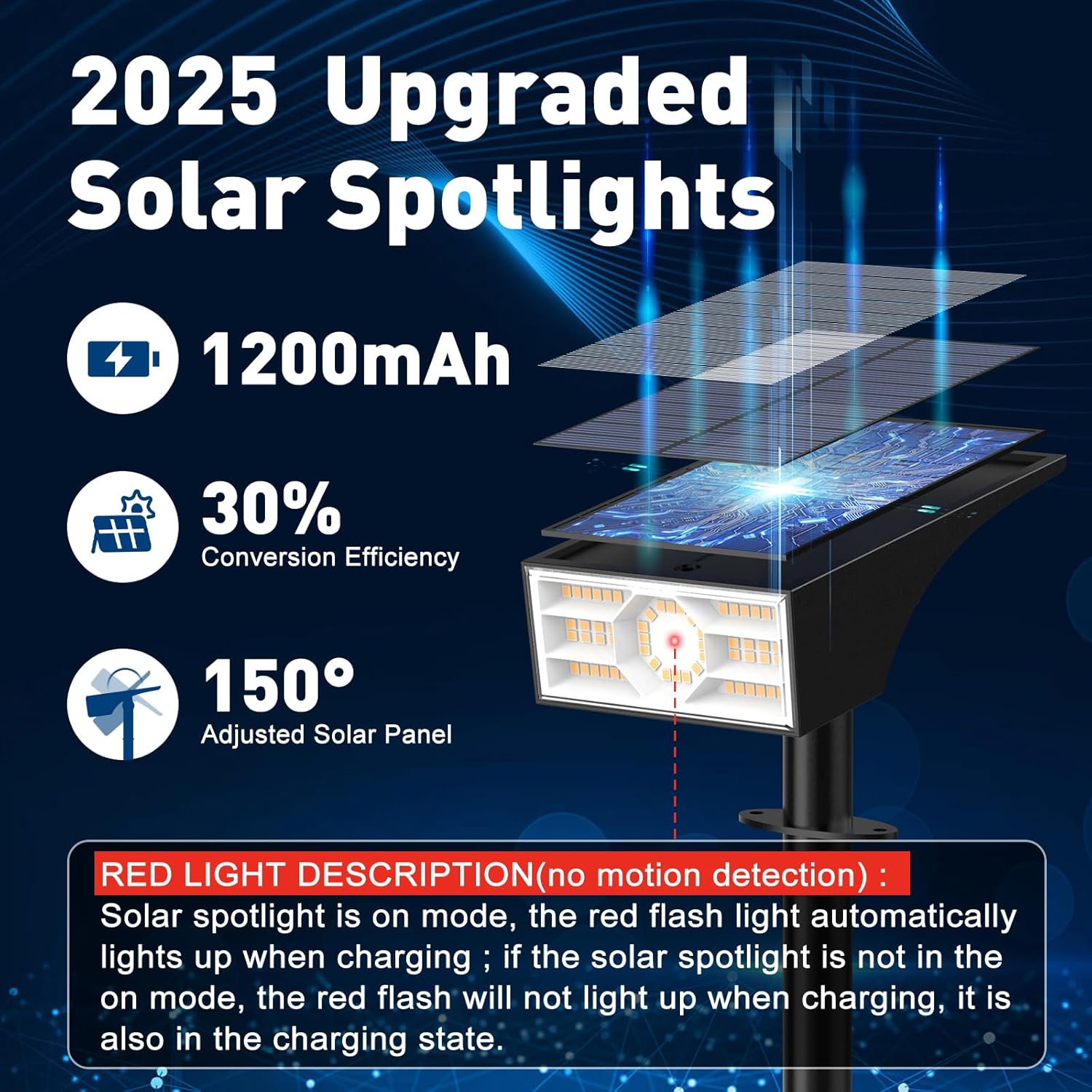 • 【𝐋𝐨𝐧𝐠-𝐋𝐚𝐬𝐭𝐢𝐧𝐠 𝐈𝐥𝐥𝐮𝐦𝐢𝐧𝐚𝐭𝐢𝐨𝐧】 Equipped with 56 LEDs, our solar spotlights create the perfect lighting effect wherever they are placed. The 150° adjustable head allows you to direct light exactly where you need it. Harness the power of the sun to brighten your garden without high electricity costs. With a maximum brightness of 1000 lumens, these solar landscape spotlights provide 8-18 hours of illumination depending on charge time—longer, brighter, and more durable than other solar spotlights on the market.