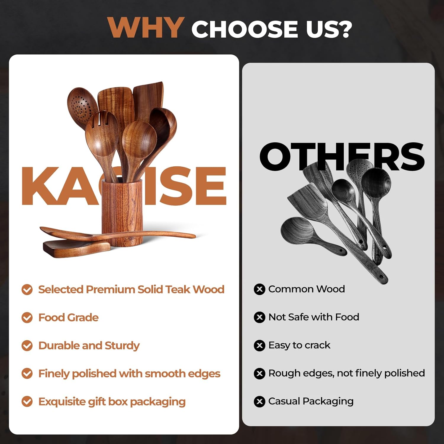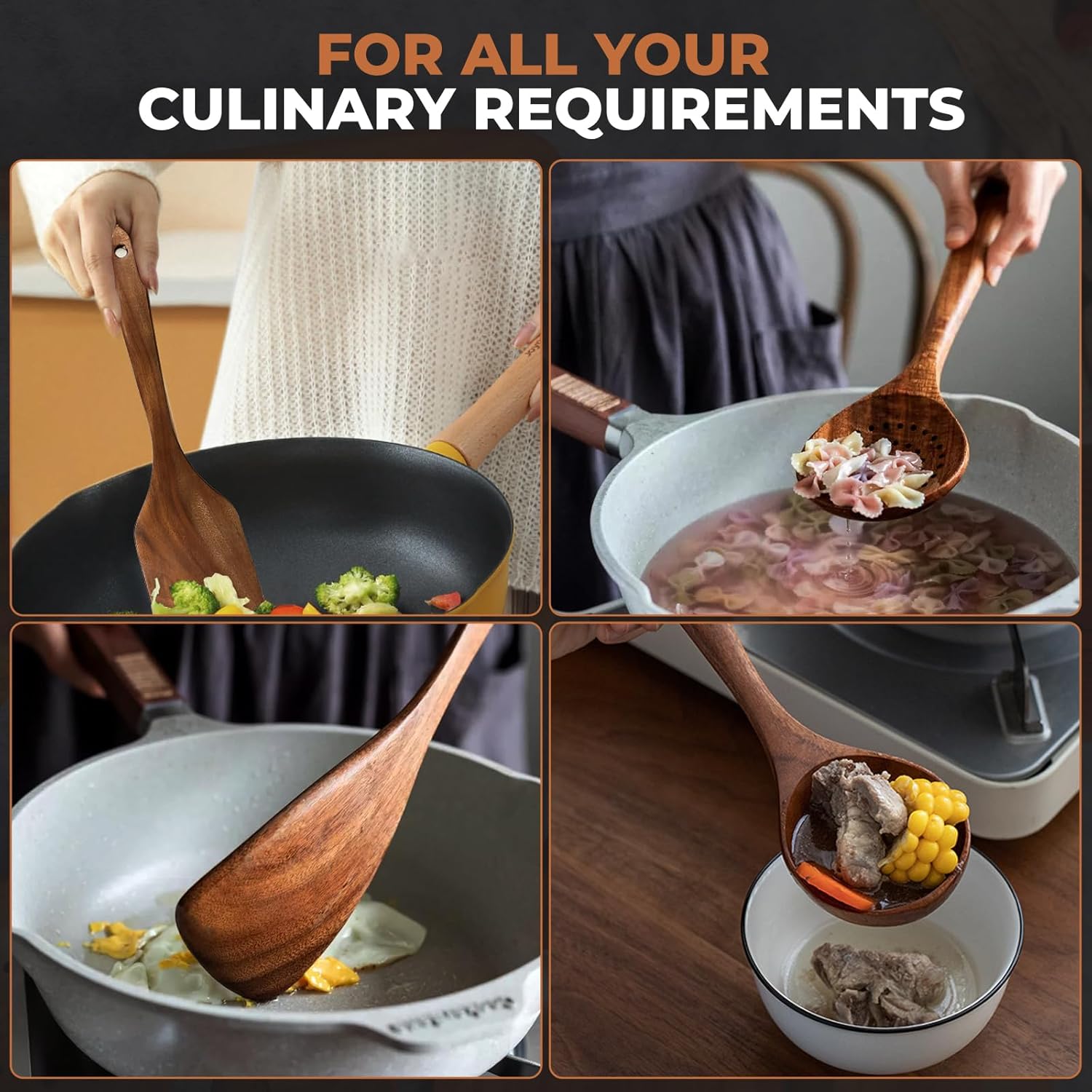 • Premium Teak: Our Wood Utensils for Cooking is crafted from 100% premium teak, renowned for its density, strength, and durability. Teak Wooden Utensil Set is exceptionally resilient and resistant to damage, ensuring a longer lifespan, making it the finest choice in culinary tools. Each piece of our Utensils for Nonstick Cookware is meticulously selected and expertly crafted to guarantee the highest quality standards. Note: Kitchen Utensils may vary in wood grain because of its natural material.
