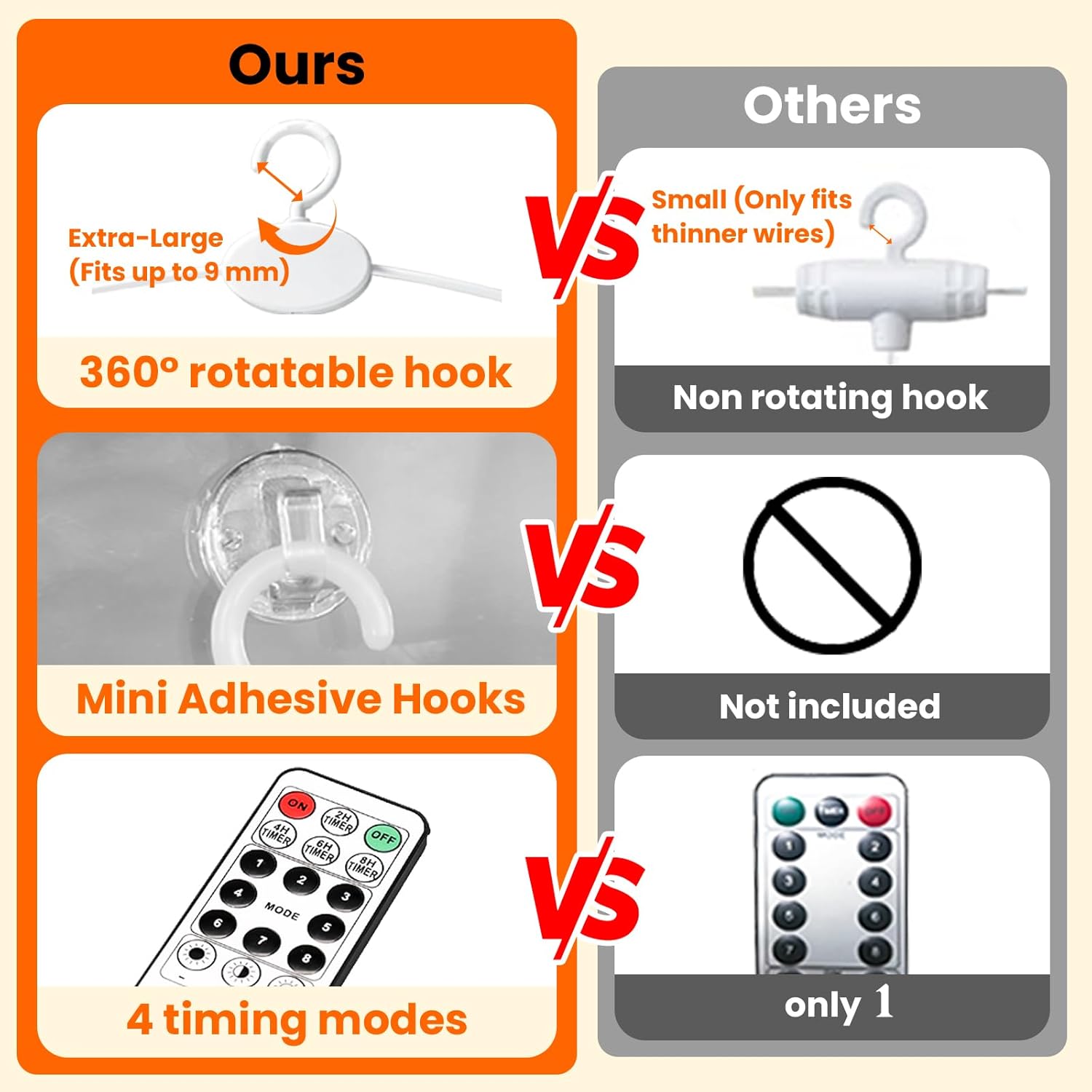 • 8 Light Settings & Timer Remote: Unlike others, our 17-Keys remote added 4 timing modes (2/4/6/8 hours on, 22/20/18/16 hours off). 8 different flash modes to choose from, and you can adjust the brightness of the lights by pressing "dim" ,“+” and "-". That are all controlled easily by a wireless remote at 10~15 meters, aim at the USB receiving direction when you press. All is in your control