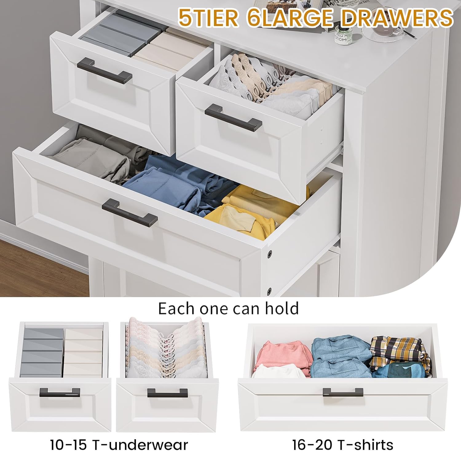 • Spacious Storage: 28.7”W x 15.7”D x 47.2”H. The wooden white dresser features 6 deep drawers (22.4”W x 12.4”D x 5”H) for ample storage space. Perfect for clothes, stocking, blankets, toys and more.