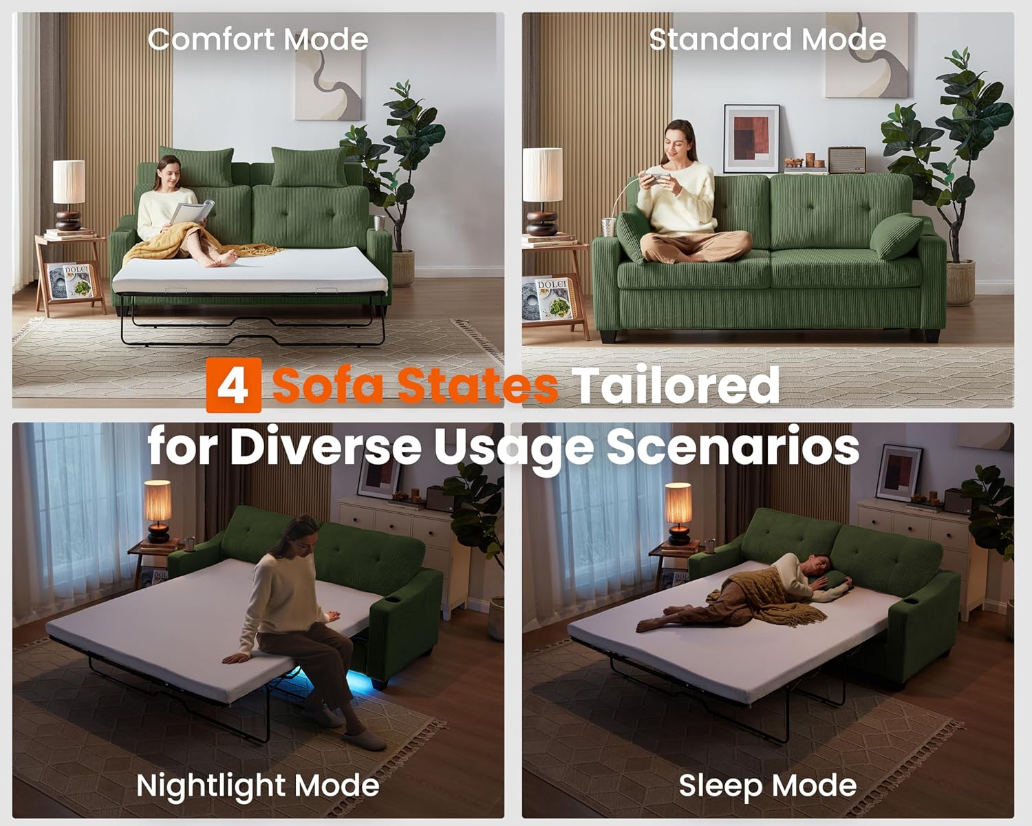• 【Four Sofa States for Various Scenarios】Our sofa bed supports four different configurations to meet your varying needs. It operates in a standard mode for daily use; by adjusting it as shown in our diagram, you enter the comfort mode, perfect for enjoying leisure time in bed; switch to the nightlight mode for easy nighttime standing; and the sleep mode optimally supports your sleeping needs