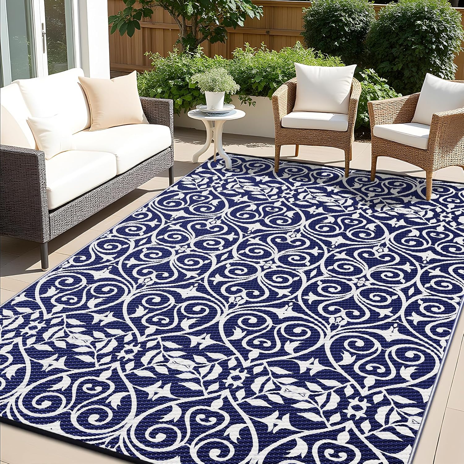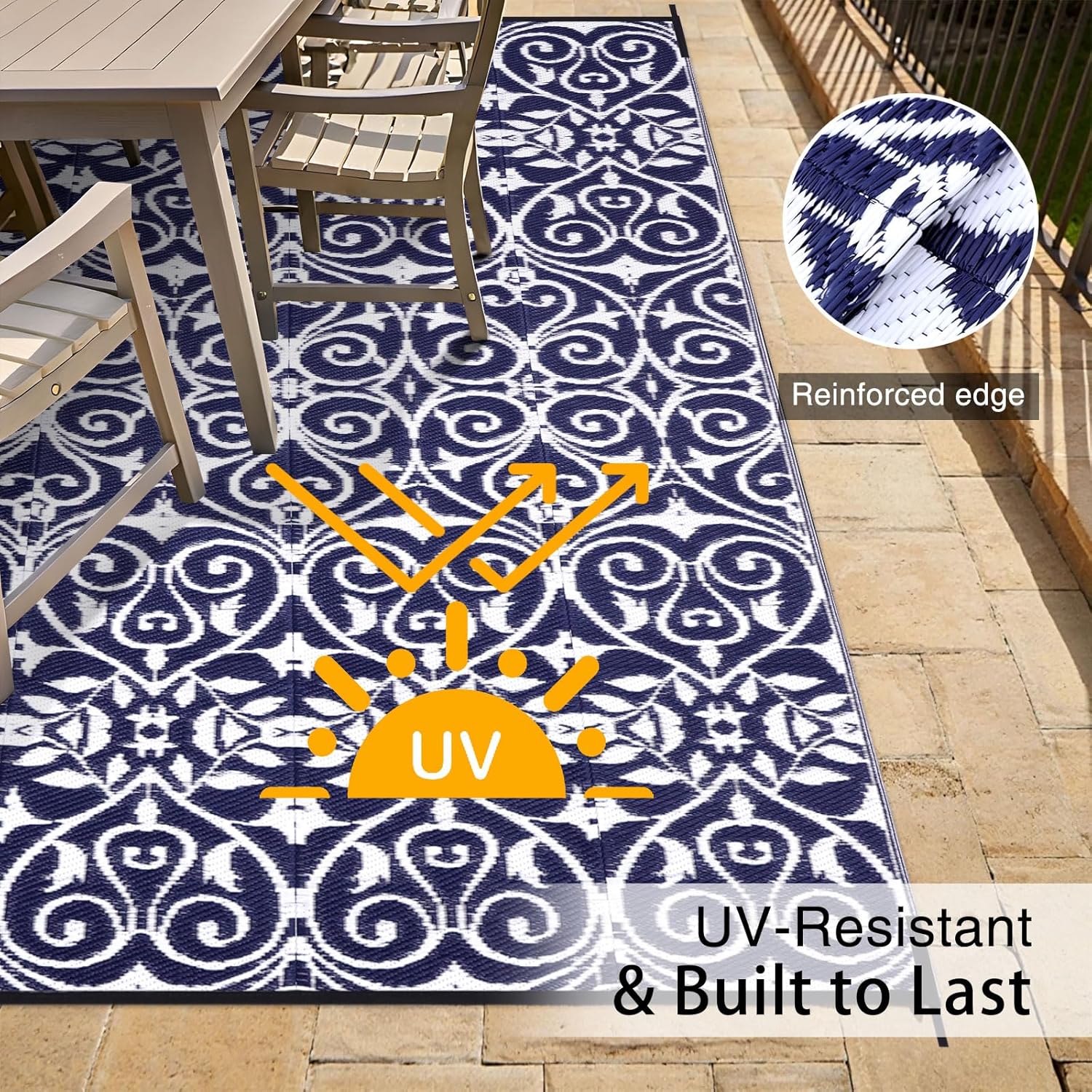• UV-Resistant & Durable: Equipped with a UV-protective layer, this outdoor patio rug resists fading, keeping its vibrant colors intact even under prolonged sun exposure. Reinforced edges add extra durability, making it a reliable choice for all-weather use.