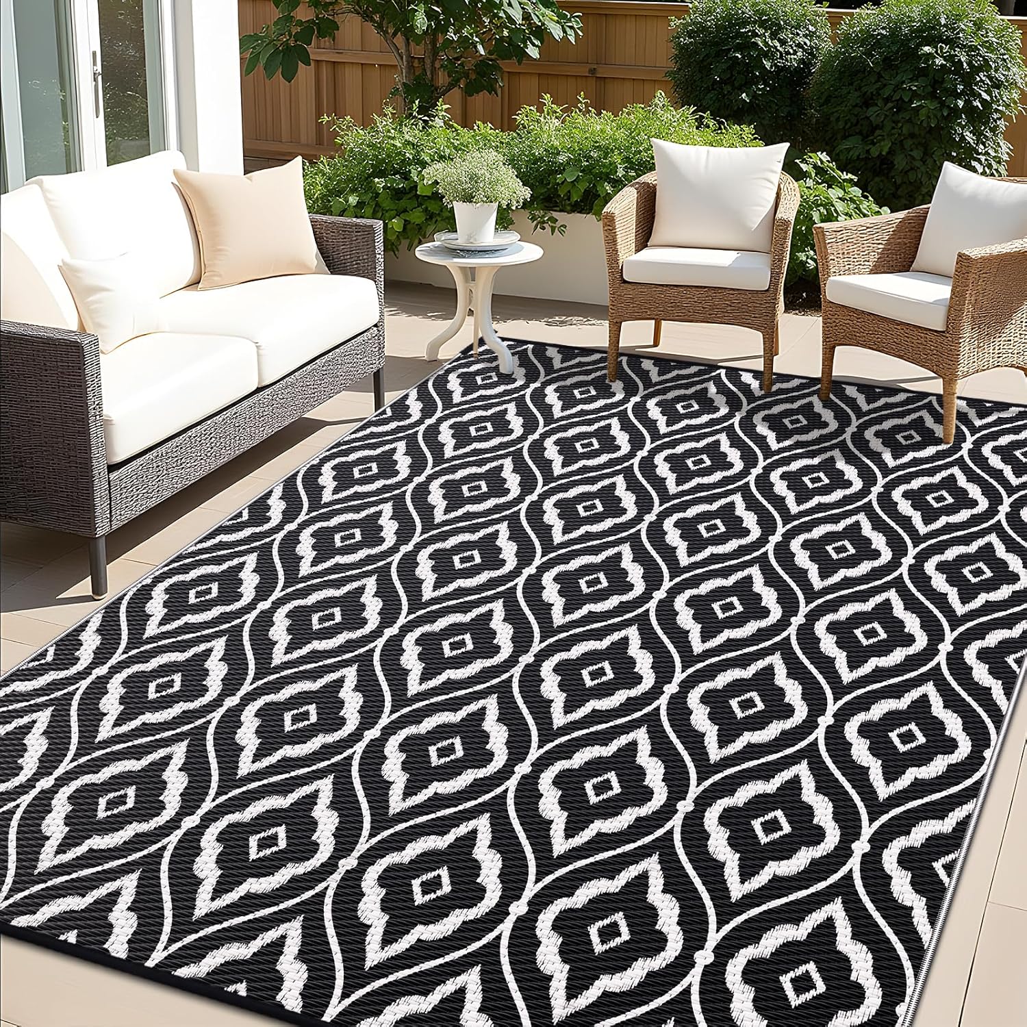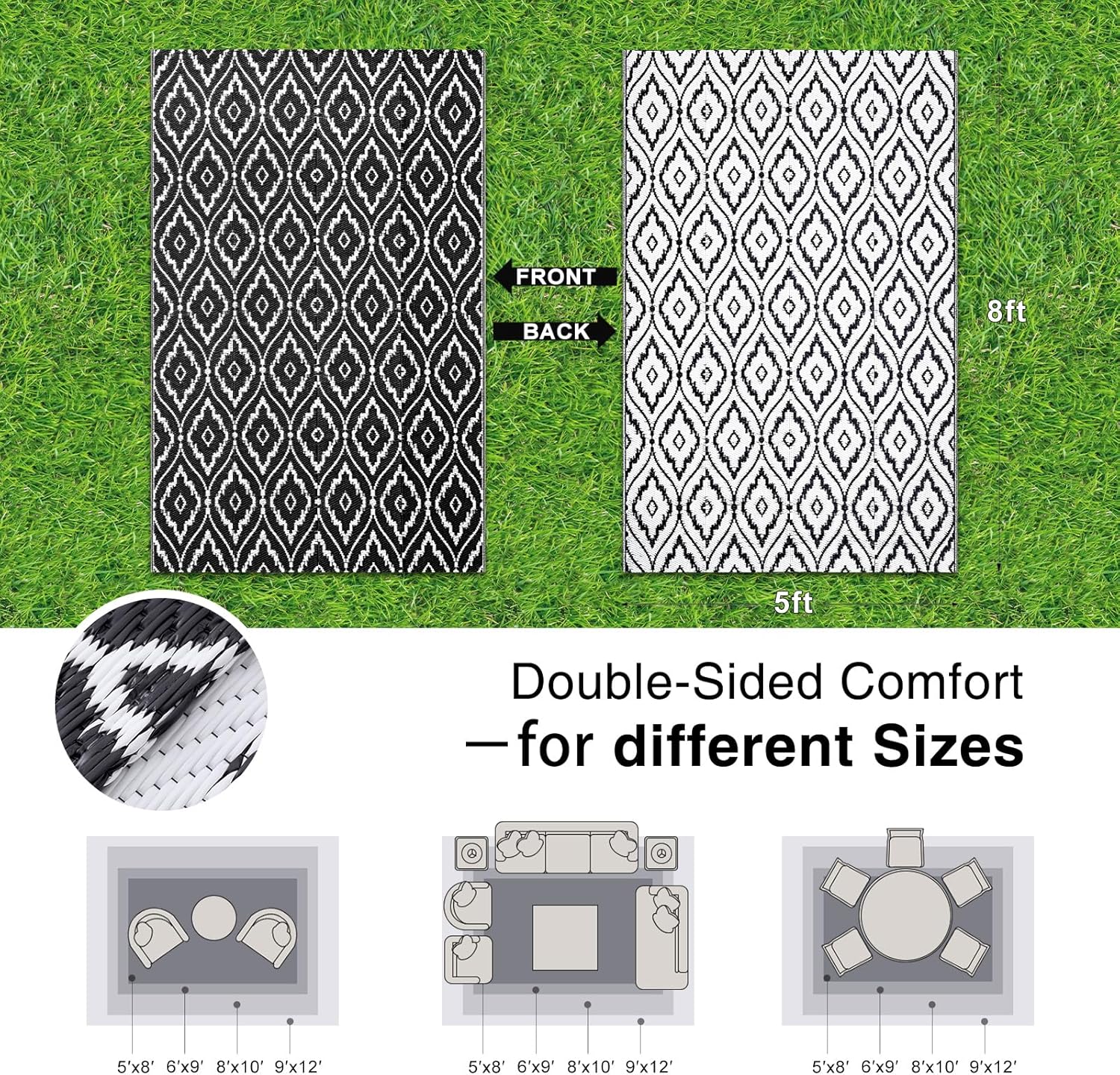 OLANLY Outdoor Rug 5x8 ft Waterproof, Outdoor Plastic Straw Rug with Geometric Pattern Clearance, Reversible RV Mat for Patio, Camping, Balcony, Deck, Backyard, Black & White