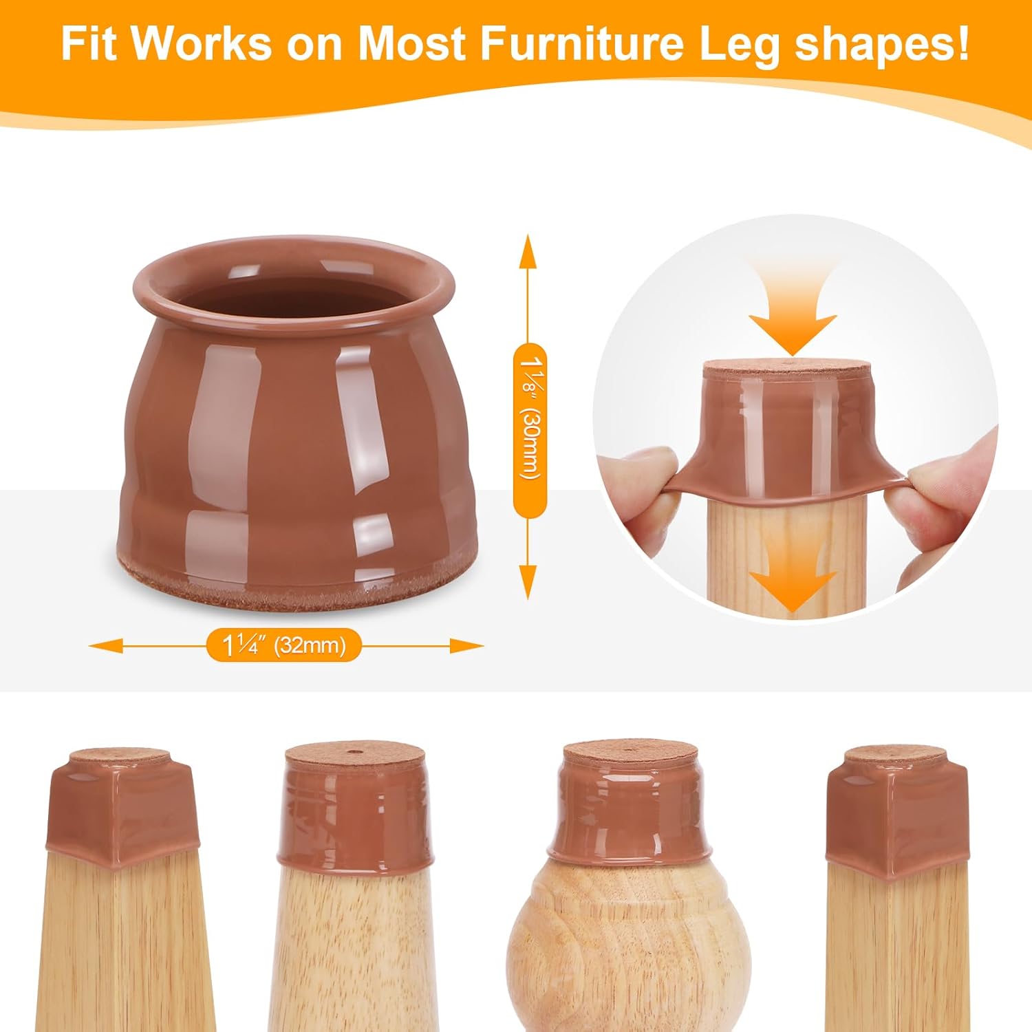 • Common Sizes: Perfectly fits chair legs with a circumference ranging from 3 3/16" to 4 9/16" (80-115mm). Round diameter 15/16" to 1 5/16" (23-32mm). Square side length 12/16”to 1 3/16" (20-28mm).