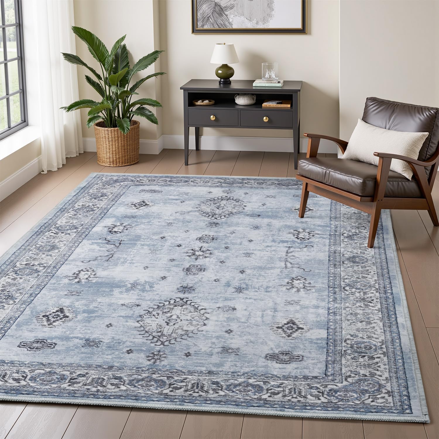 AMOAMI-Vintage Area Rug 3x5 Blue Rugs for Living Room-Soft Washable Rug Non Slip Entryway Rug Indoor Vintage Throw Accent for Bedroom Laundry Room Dining Bathroom Bedside