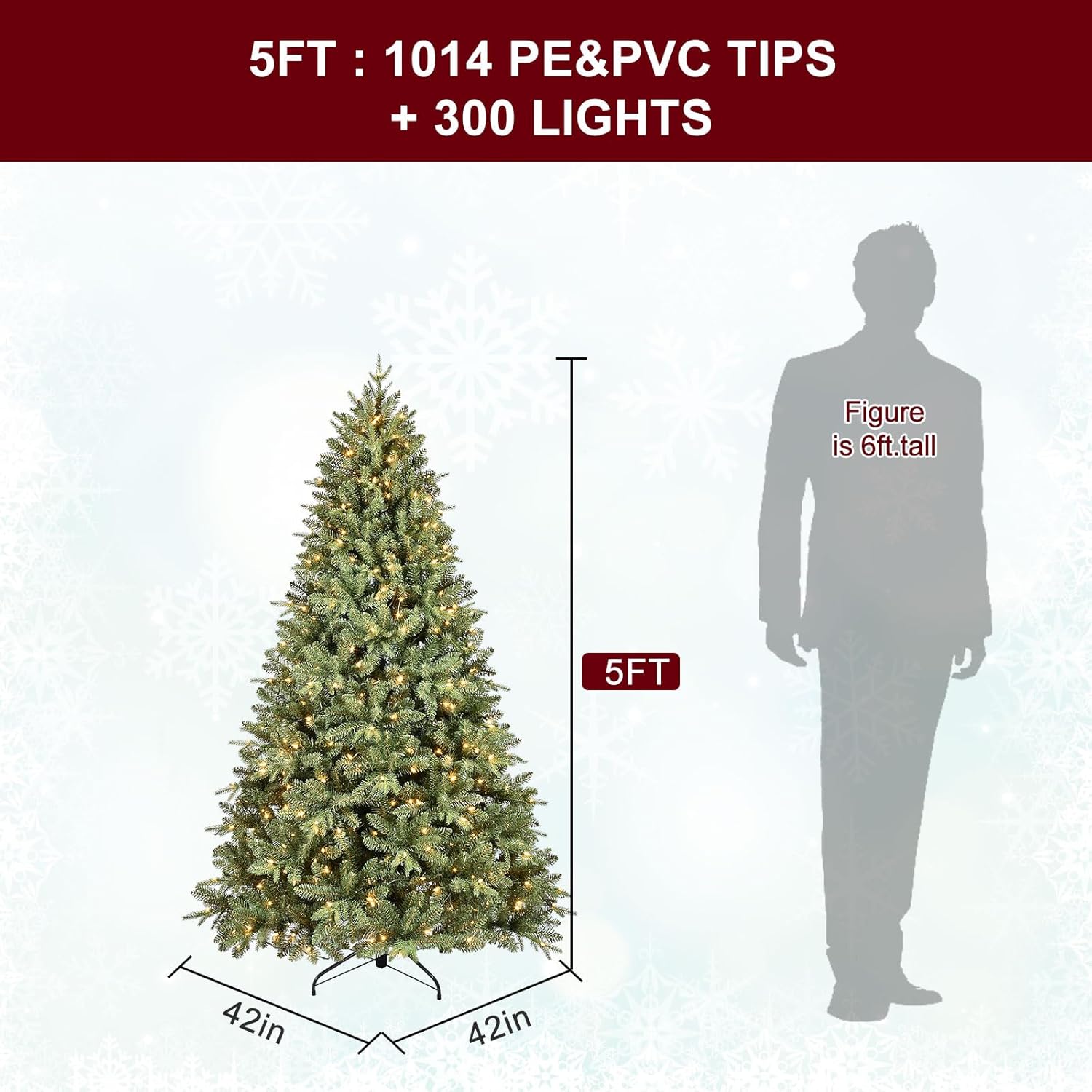 • Pre-Lit Warm White Lights: The 5 ft fake Christmas tree comes pre-strung with 300 warm white UL-certified lights, so you can skip the hassle of untangling and jump right into the fun part—decorating