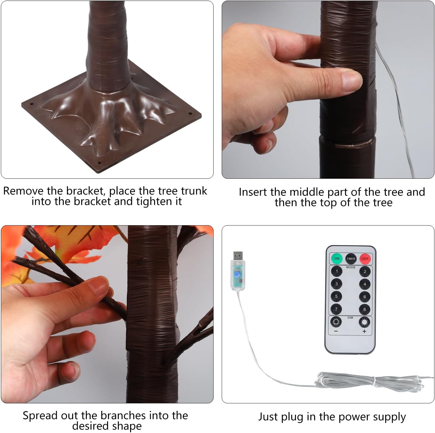 • 🍁【Packaging and Installation】Autumn tree decorations are made of plastic,copper wire and silk leaves. The lighted Fall Tree is IP44 waterproof (except base). There are four maple tree lights and four USB cables in each package. The base and trunk of the maple tree lamp can be disassembled, and the installation is also very simple, just connect the buckle of the trunk and the base.The branches of the lighted fall trees are wrapped in electrical tape to hide the wires and are safe to use. The hinged design of the square base combined with the metal trunk provides stability to the maple.can stay upright and not tilt easily.