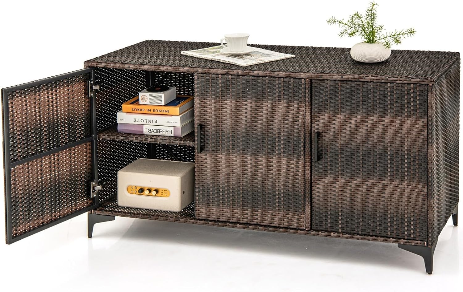RELAX4LIFE 84-Gallon Outdoor Storage Box - Wicker Rattan 3-Door Patio Storage Cabinet Container w/Removable Shelves for Cushions, Garden Tools, Pool & Sports Equipment, Indoor Outdoor Deck Box (Brown)