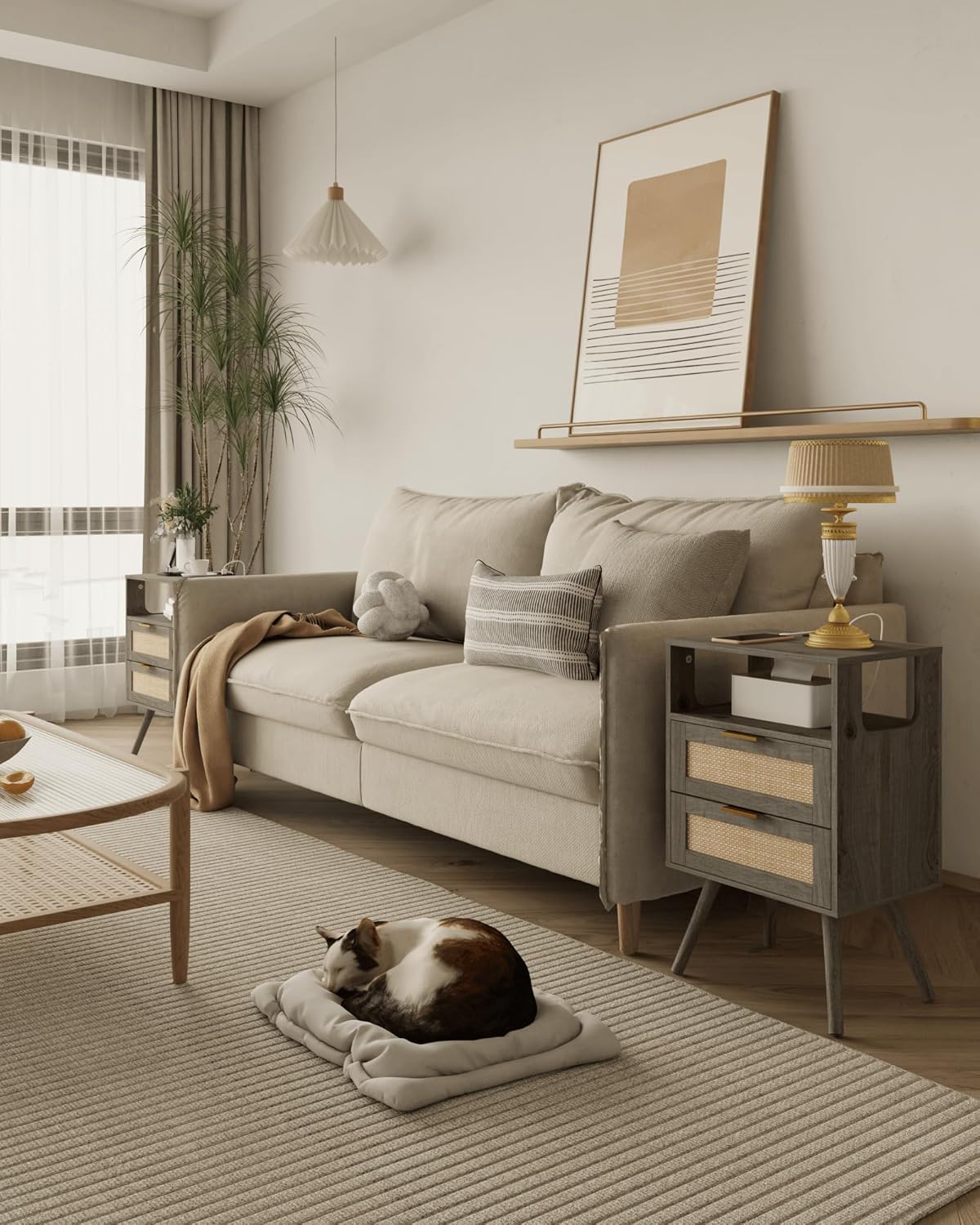 • Embrace the farmhouse touch: A classic grey oak with rattan face, this nightstand gives off a farmhouse touch in your bedroom. With a row insert makes it more practical, the atmosphere lamp is a good addition to the fun of life, it can also be used as a side table or coffee table for the whole family to attract attention, adding elegance to family life.