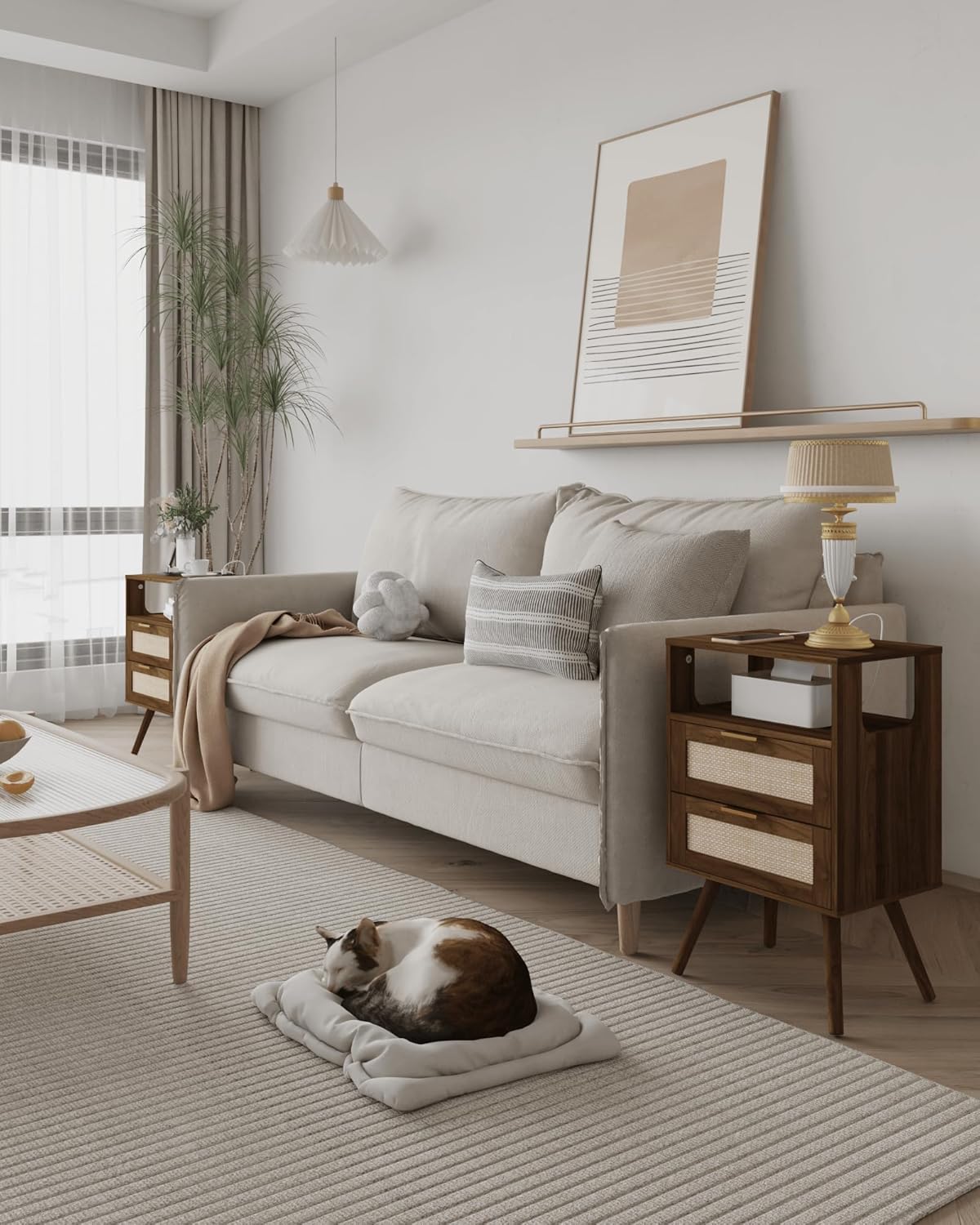 • Embrace the farmhouse touch: A classic Walnut Brown with rattan face, this nightstand gives off a farmhouse touch in your bedroom. With a row insert makes it more practical, the atmosphere lamp is a good addition to the fun of life, it can also be used as a side table or coffee table for the whole family to attract attention, adding elegance to family life.