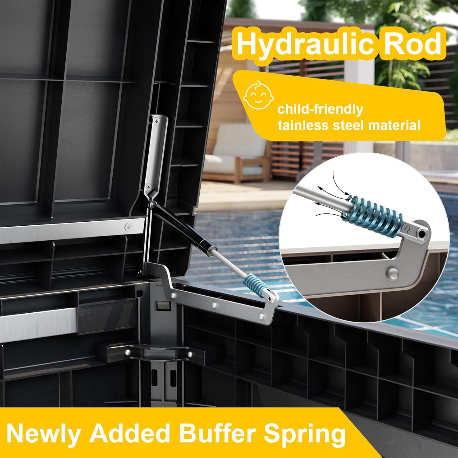 • Safety design: Each deck box has lockable holes (not included) for added security; in addition, the box is equipped with a hydraulic stand, which allows easy opening and slow closing and prevents hand pinching. The outdoor waterproof deck box has built-in handles on both sides, ensuring easy grabbing and moving