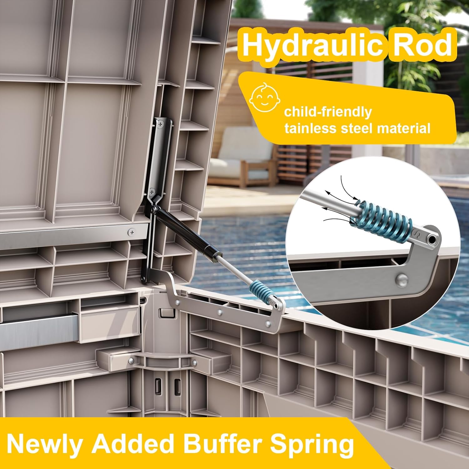 • Safety design: Each deck box has lockable holes (not included) for added security; in addition, the box is equipped with a hydraulic stand, which allows easy opening and slow closing and prevents hand pinching. The outdoor waterproof deck box has built-in handles on both sides, ensuring easy grabbing and moving