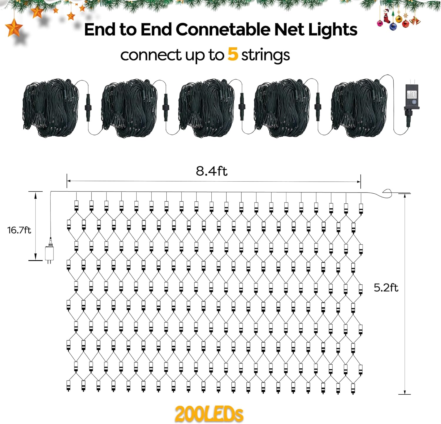 WBao Outdoor Christmas Lights 200LED F8 Big Bulbs, 8.4ft x 5.2ft Christmas Net Lights with 8 Modes, Timer, End to End Connectable, Waterproof for Lawn, Bushes Outdoor Christmas Decorations, Warm White