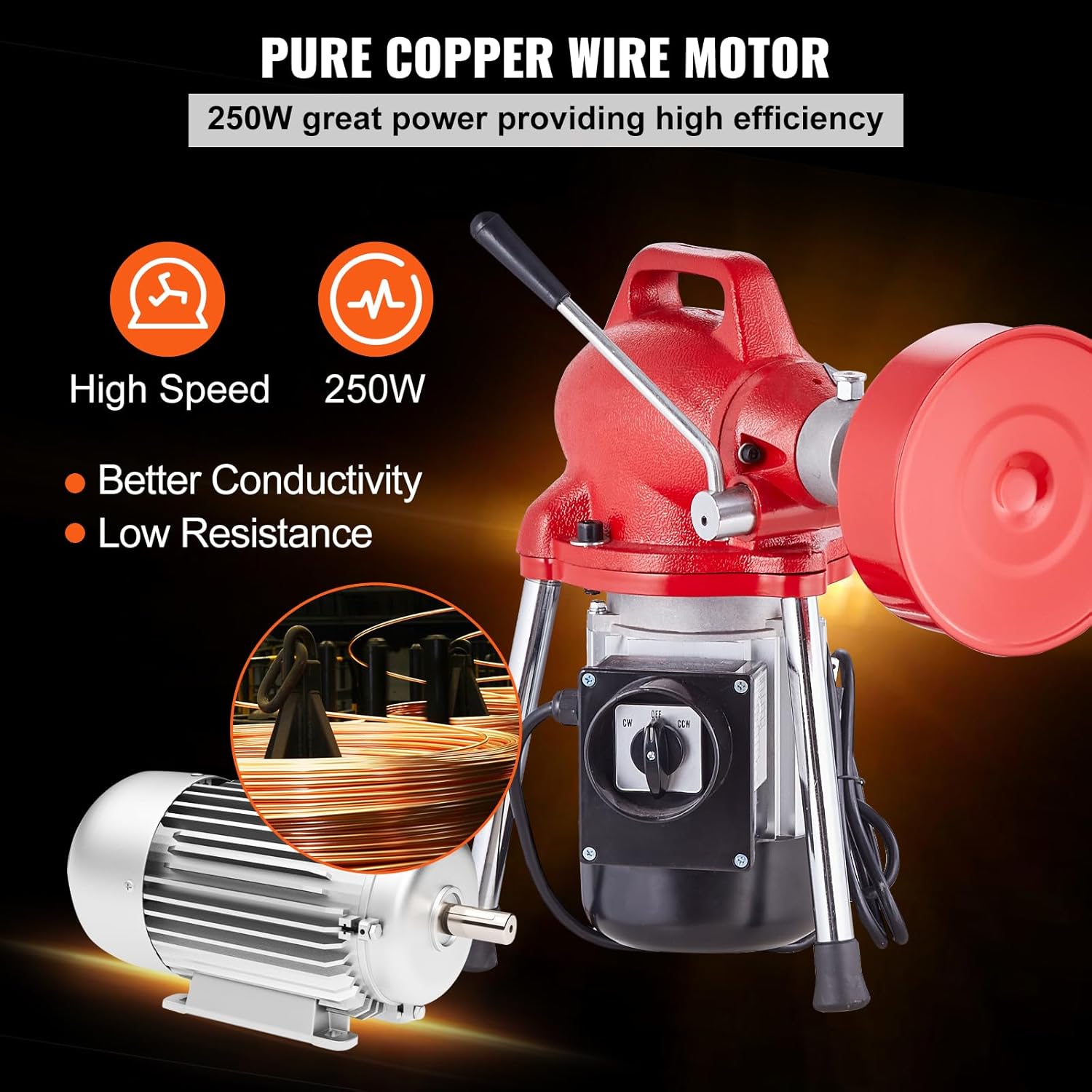 • 250W Efficient Motor: Our sewer auger features a powerful 250W motor, running at high speed for efficient and rapid drain cleaning. The copper wire motor provides superior conductivity, low resistance, and high efficiency, tackling tough clogs with ease